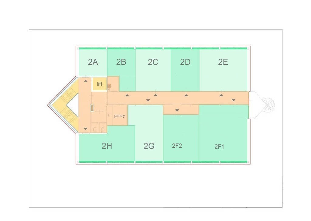 Op de 2e verdieping kunnen de ruimtes apart en gezamenlijk gehuurd worden met de volgende indeling: Entree/ portaal, toiletten, bergruimte, 12x kantoorruimtes en pantry.