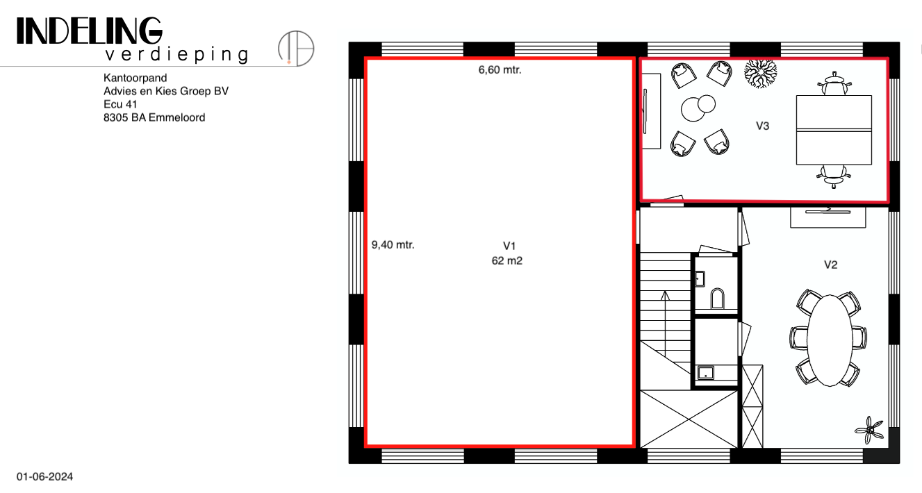 • Ruimte V1: 62 m² + gebruik van aparte ingerichte spreekkamer ca. 20 m².