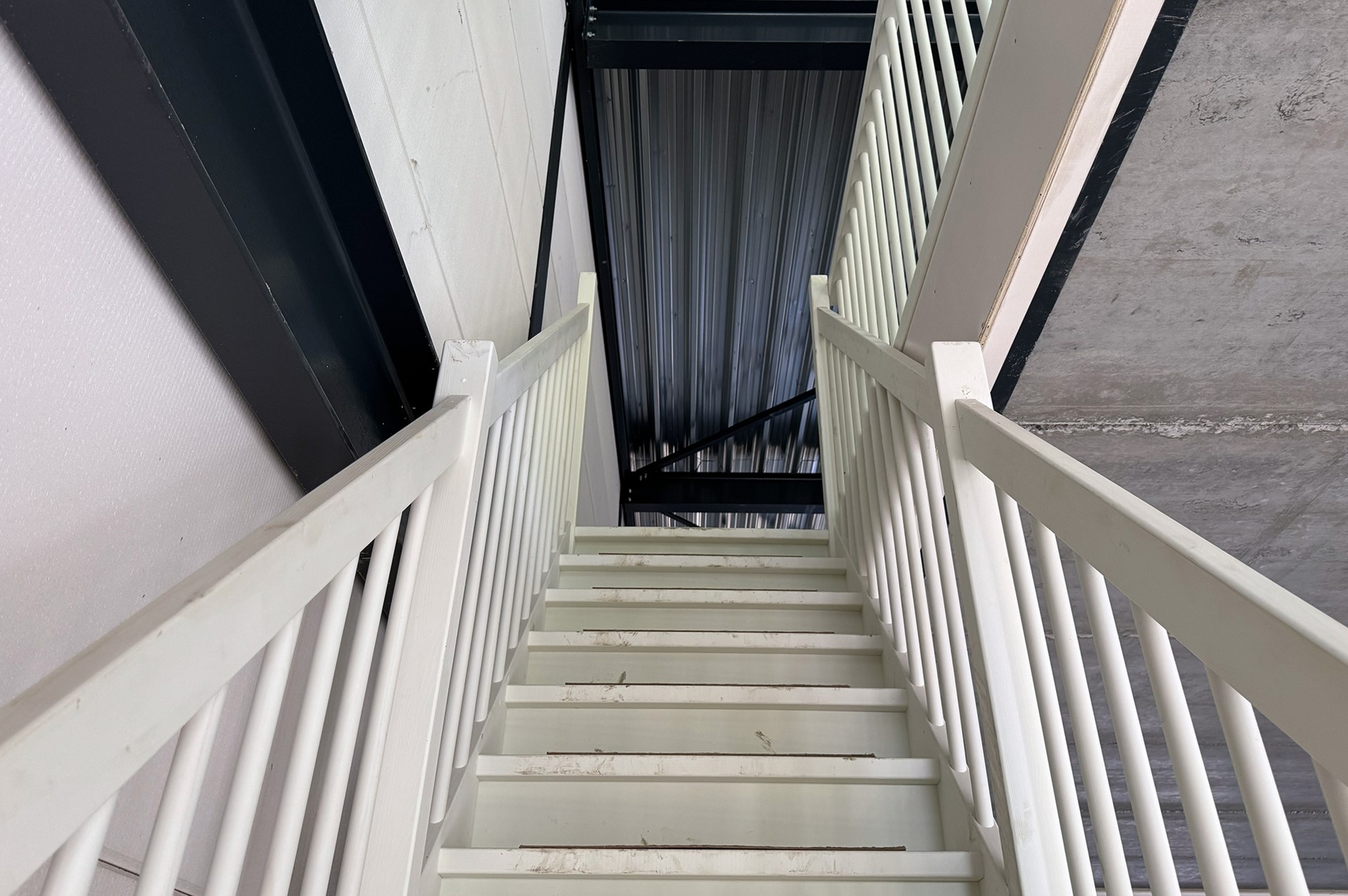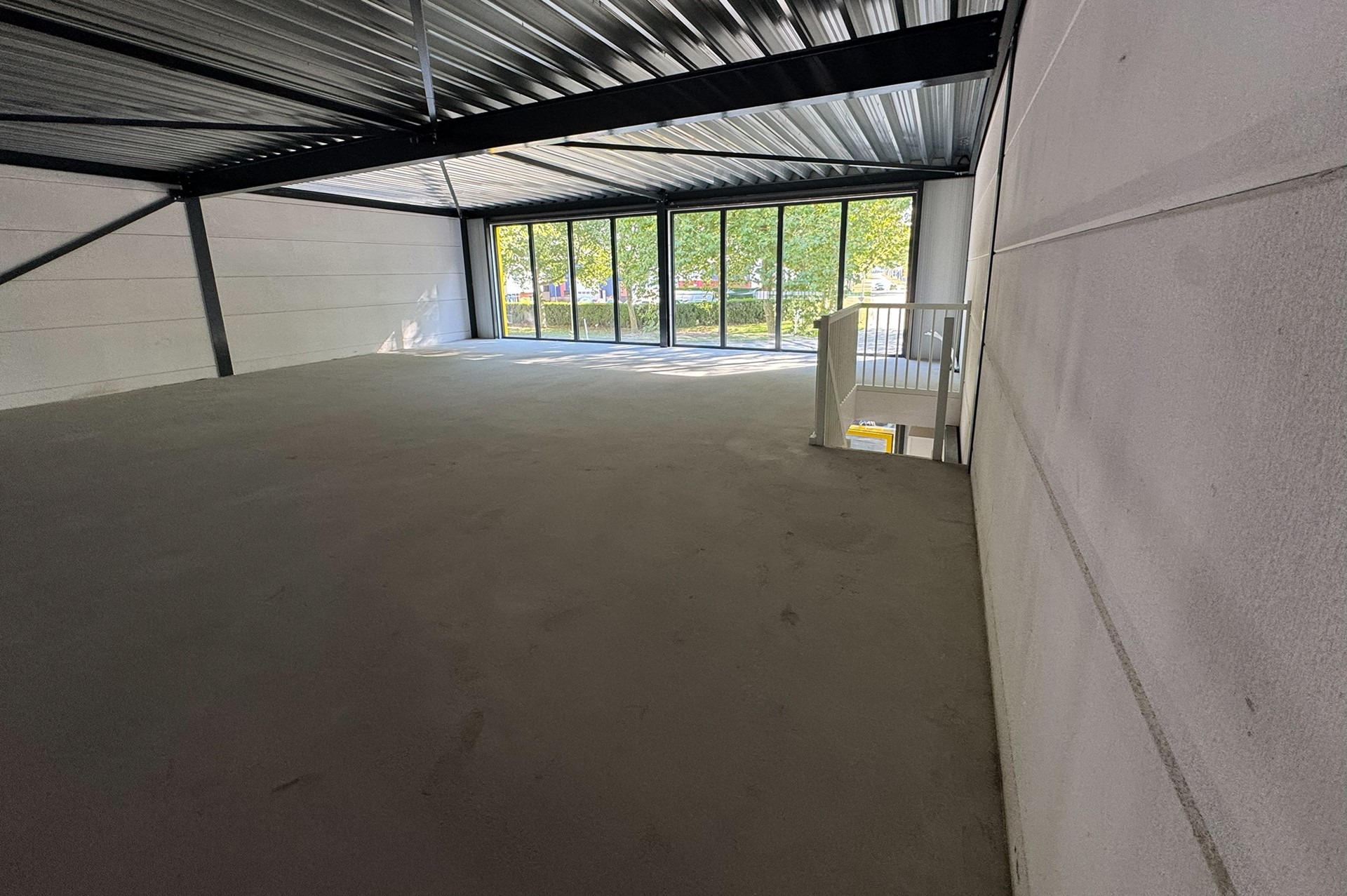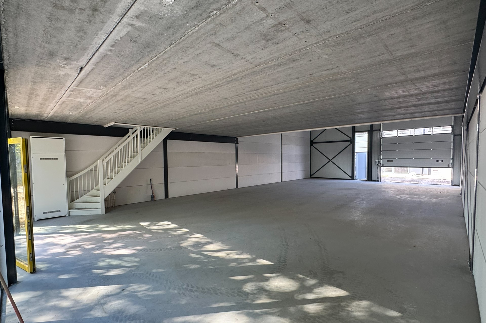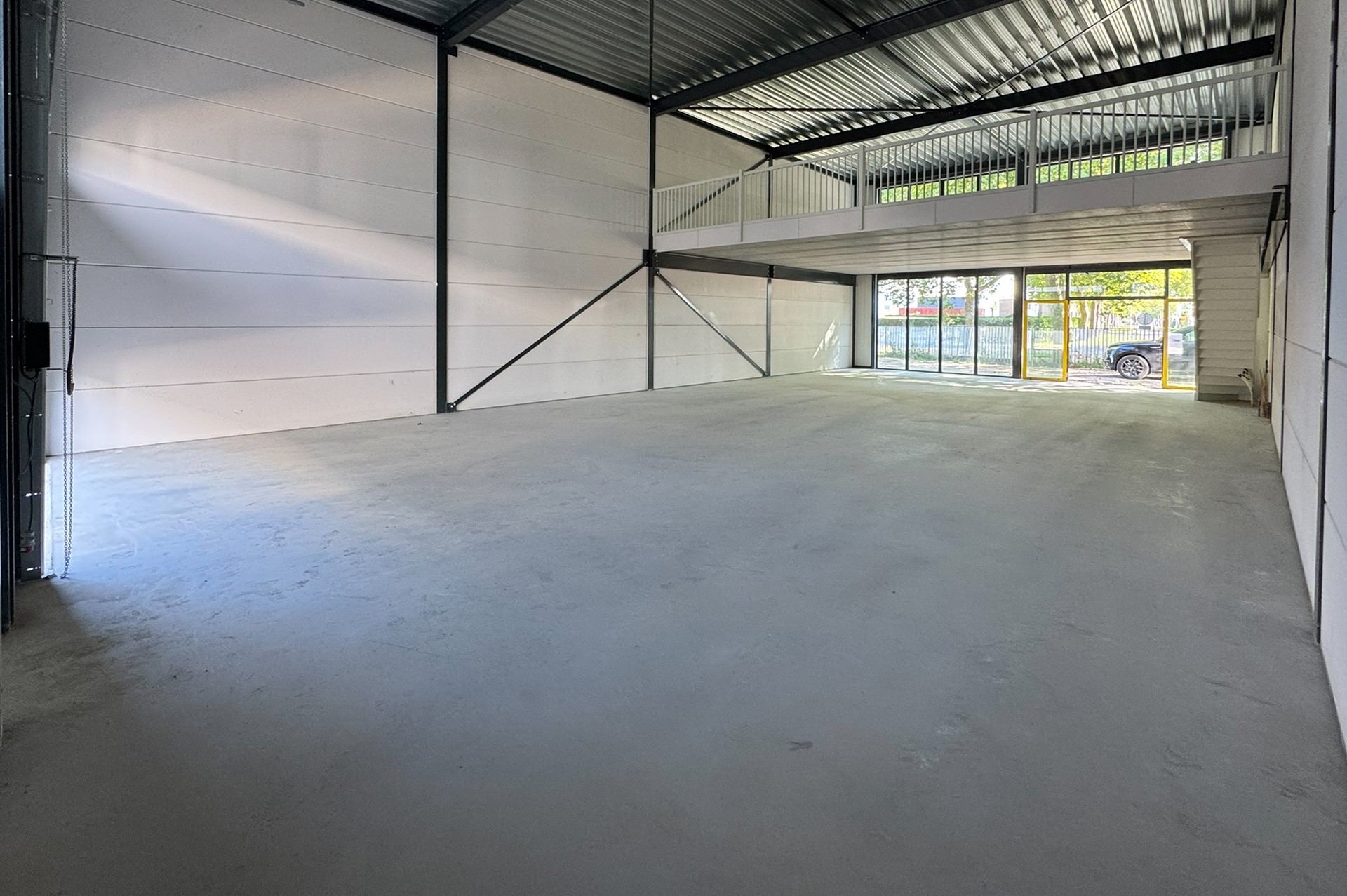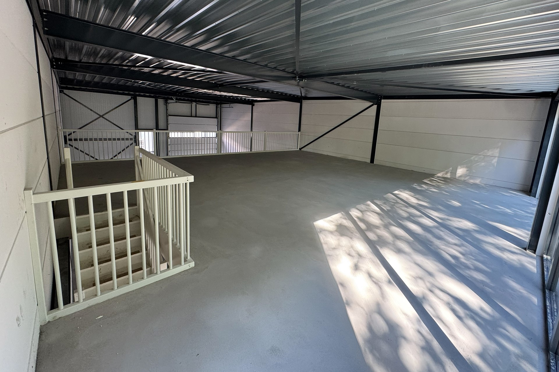 Binnen is de ruimte licht, open en flexibel in te delen. De betonnen verdiepingsvloer van circa 110 m² biedt mogelijkheden voor kantoorruimte, kantine of extra opslag.