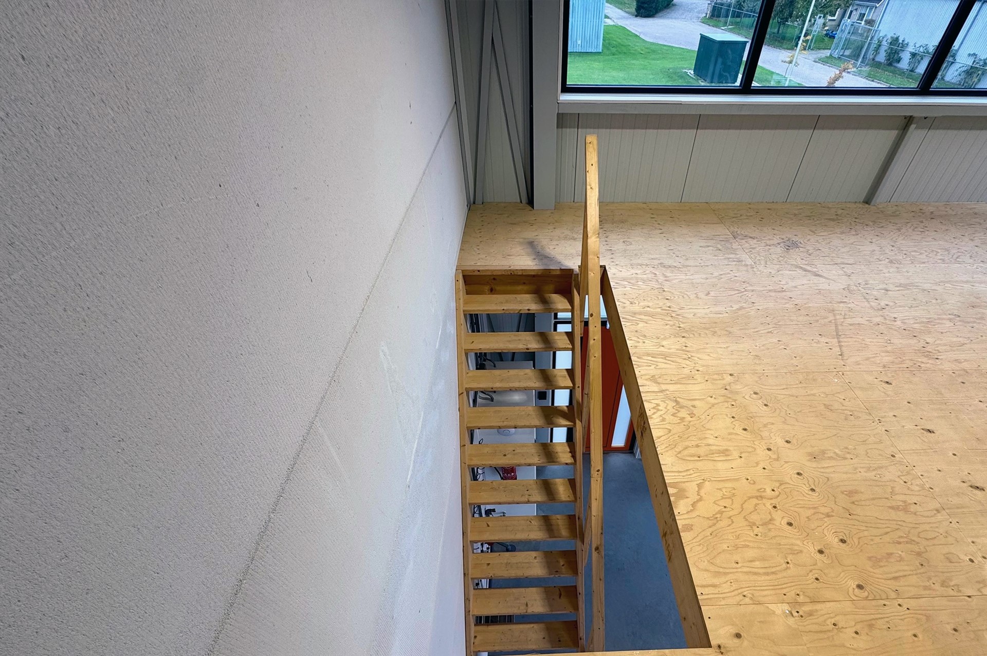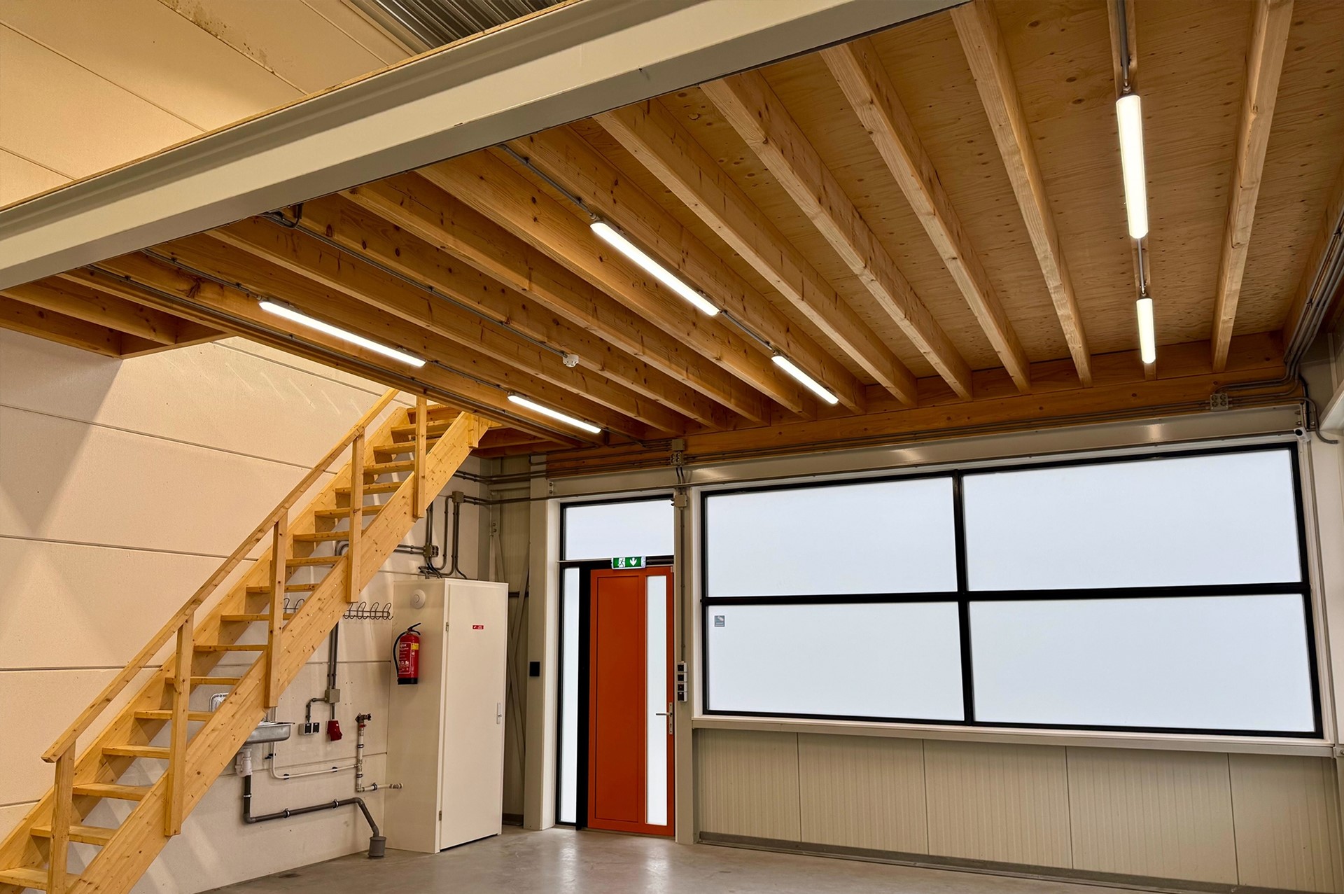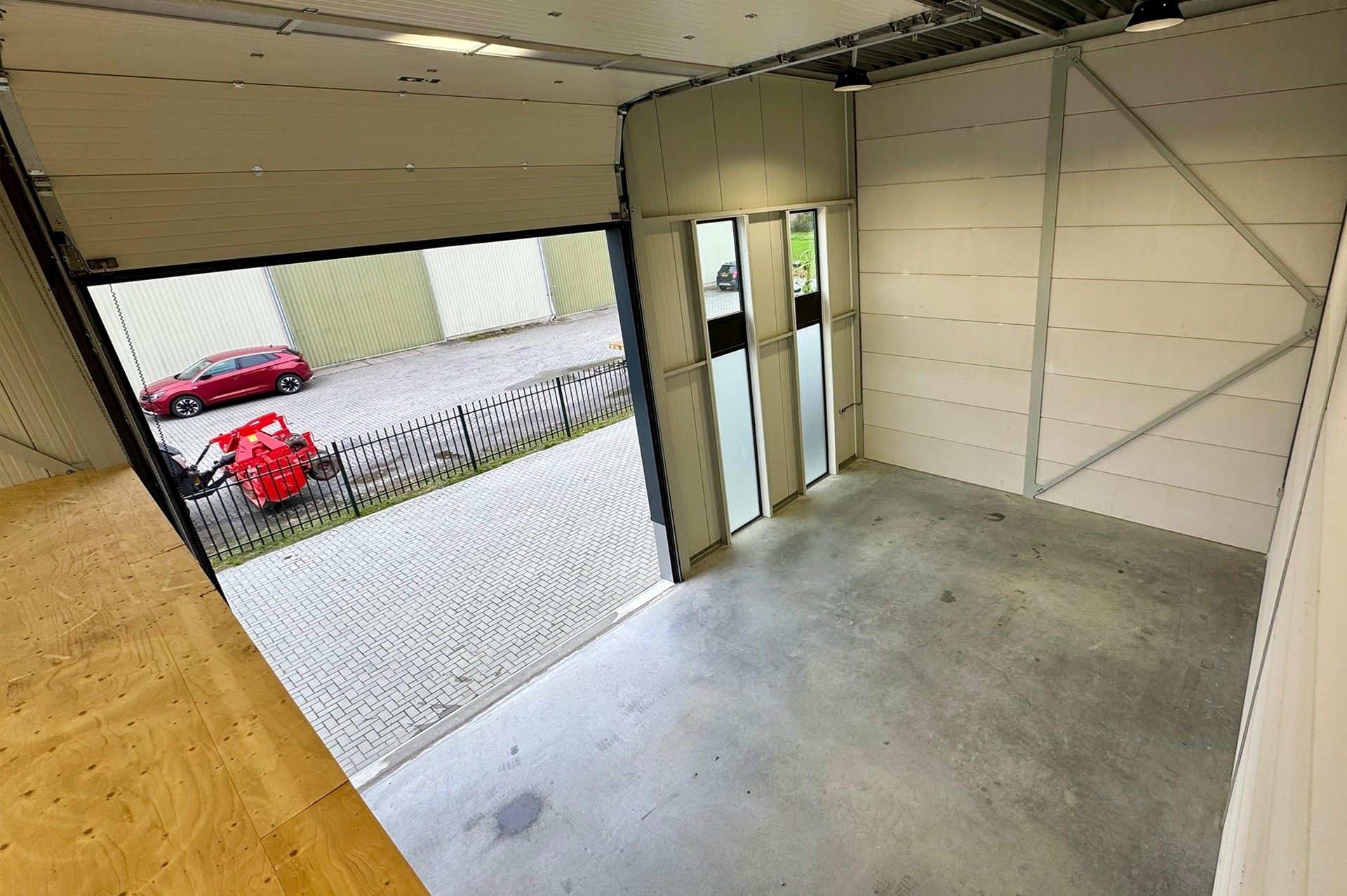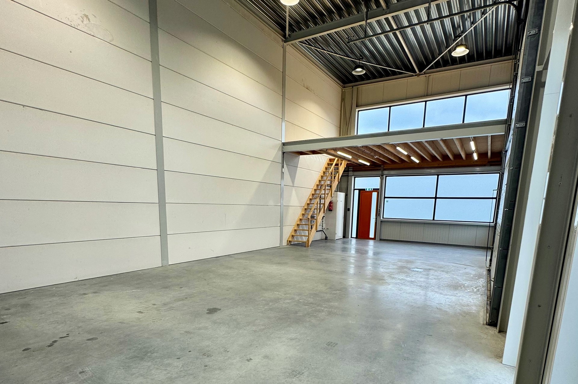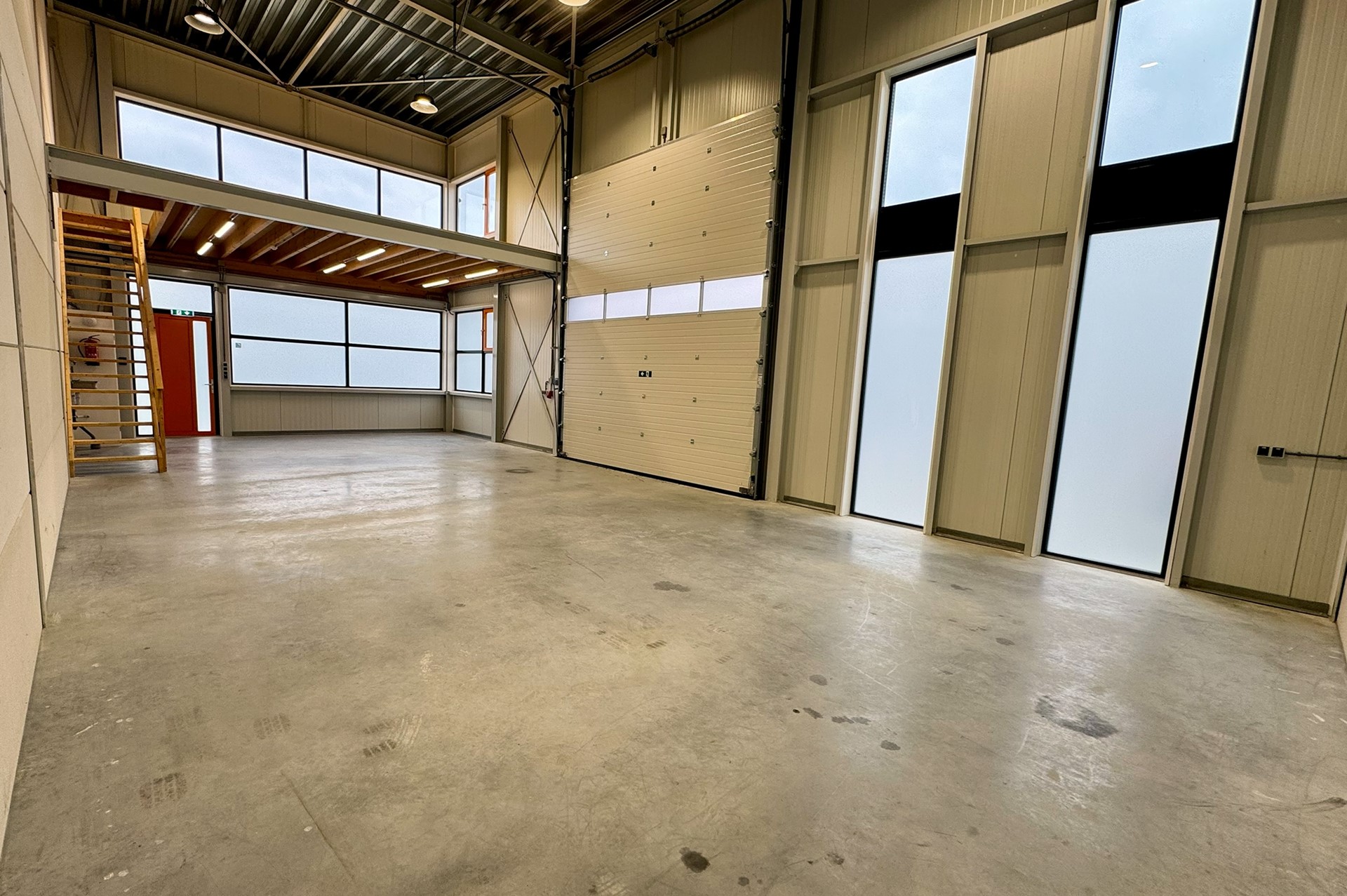 De ruimte is voorzien van een eigen entree met elektrische overheaddeur (ca. 4,5 m breed x 5,0 m hoog) en een aparte loopdeur. Dankzij de royale raampartijen beschikt het pand over veel daglicht. De verdieping leent zich uitstekend voor het realiseren van een kantoor- of kantineruimte.