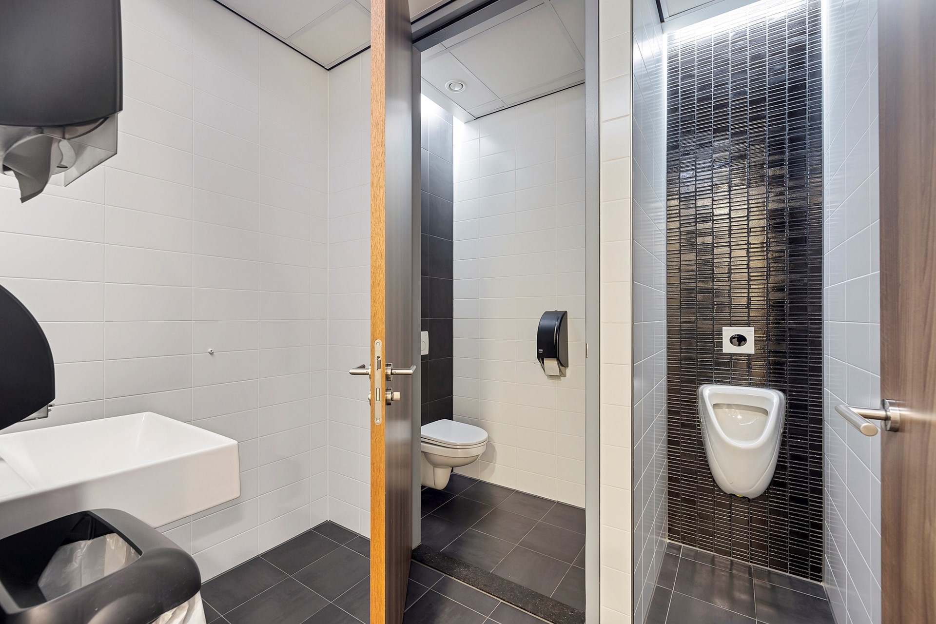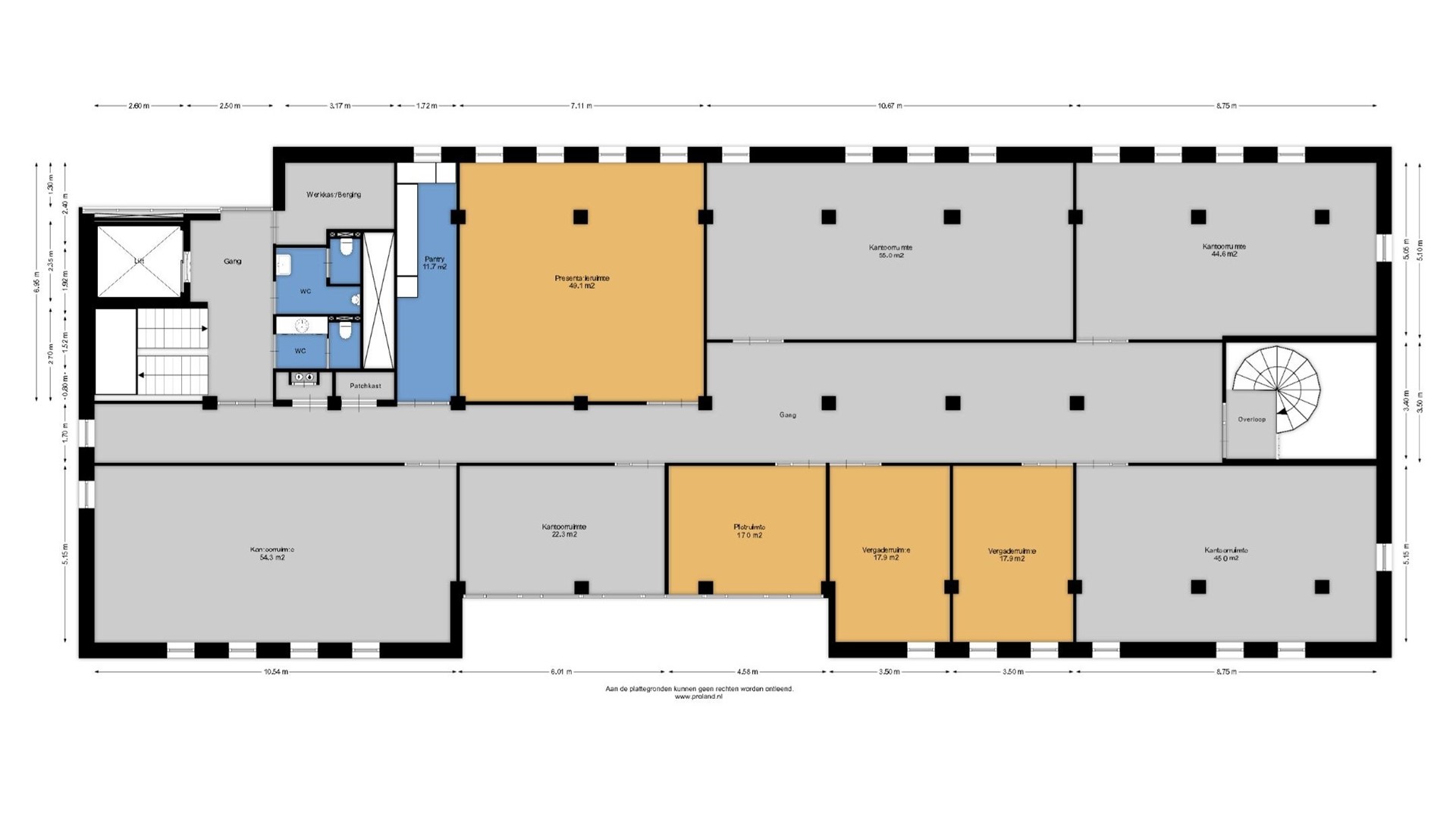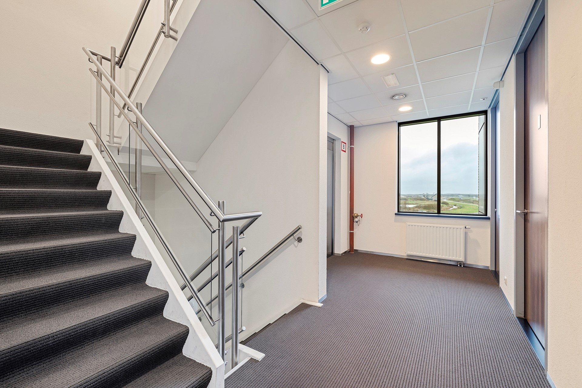 Op elke etage is uiteraard een stopplaats voor de lift en is steeds een dubbele toiletgroep, berging en pantry aanwezig.