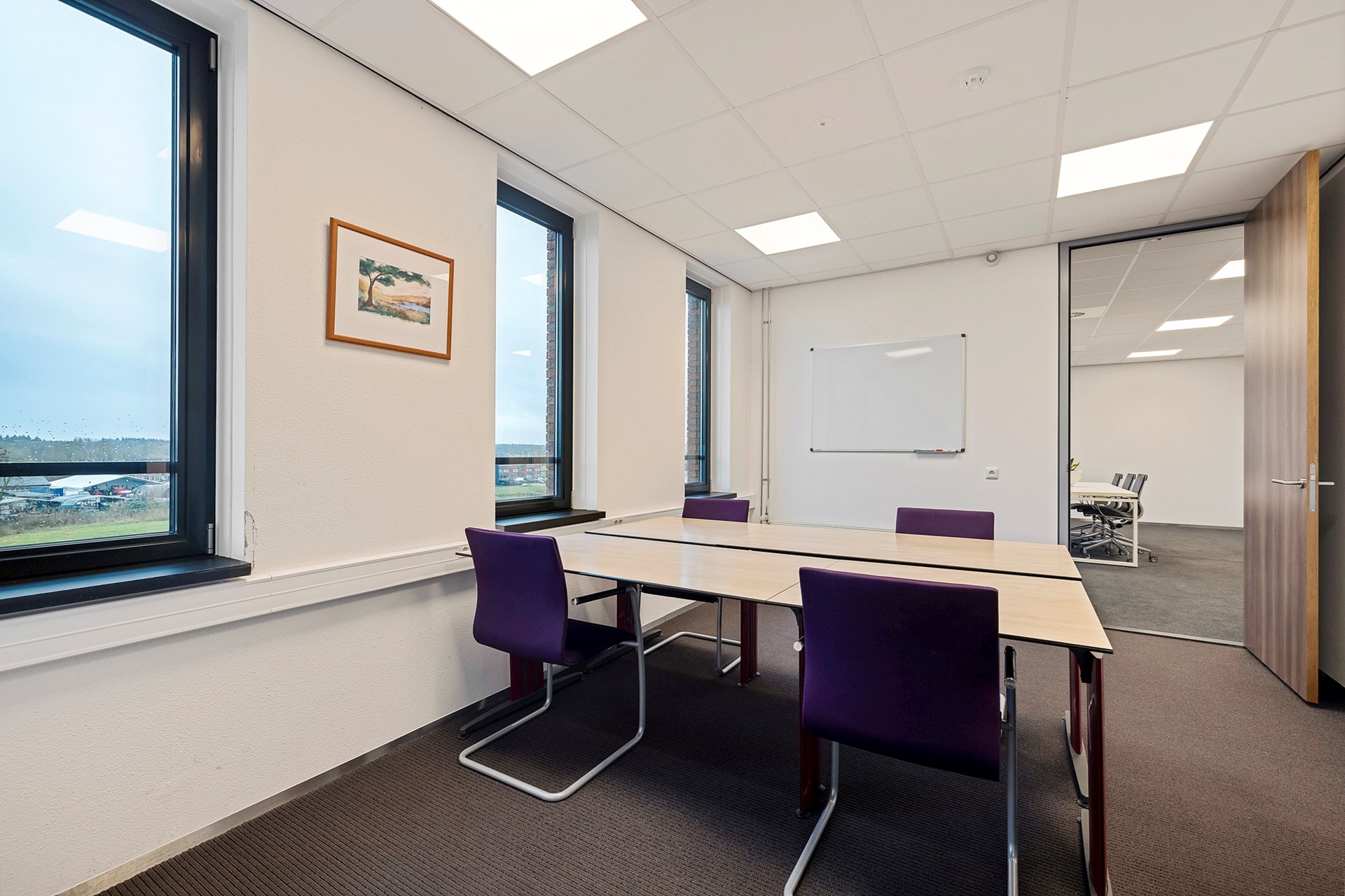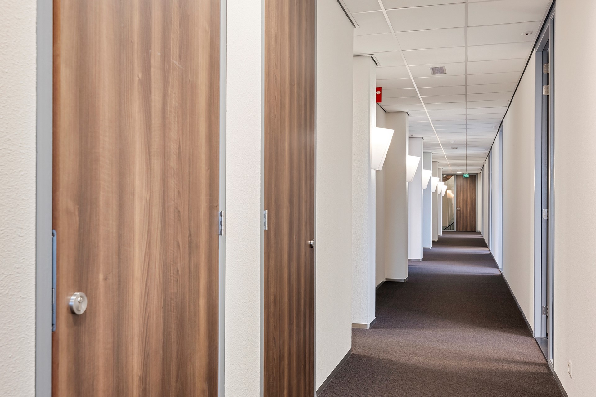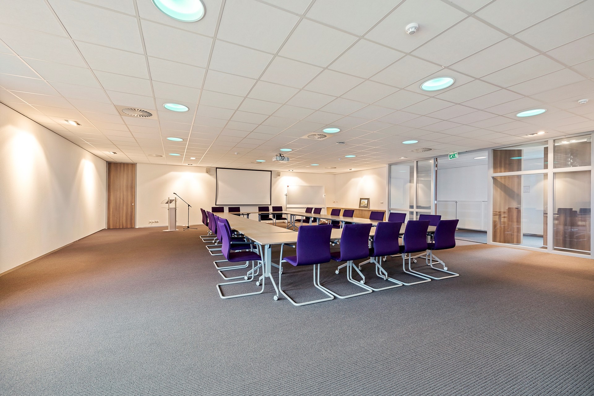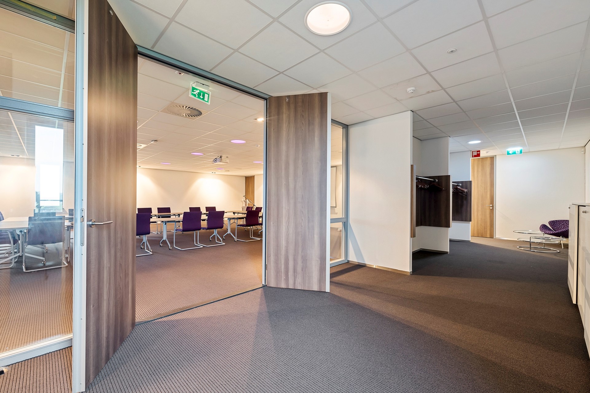 De centrale gang is korter, heeft aan de rechterzijde een viertal kantoren en eindigt eerder met een toegang naar de grote vergaderruimte met royale garderobe. Achter de vergaderruimte bevinden zich twee bergingen t.b.v. de opslag van o.a. tafels en stoelen waardoor de vergaderruimte in meerdere opstellingen kan worden gebruikt.