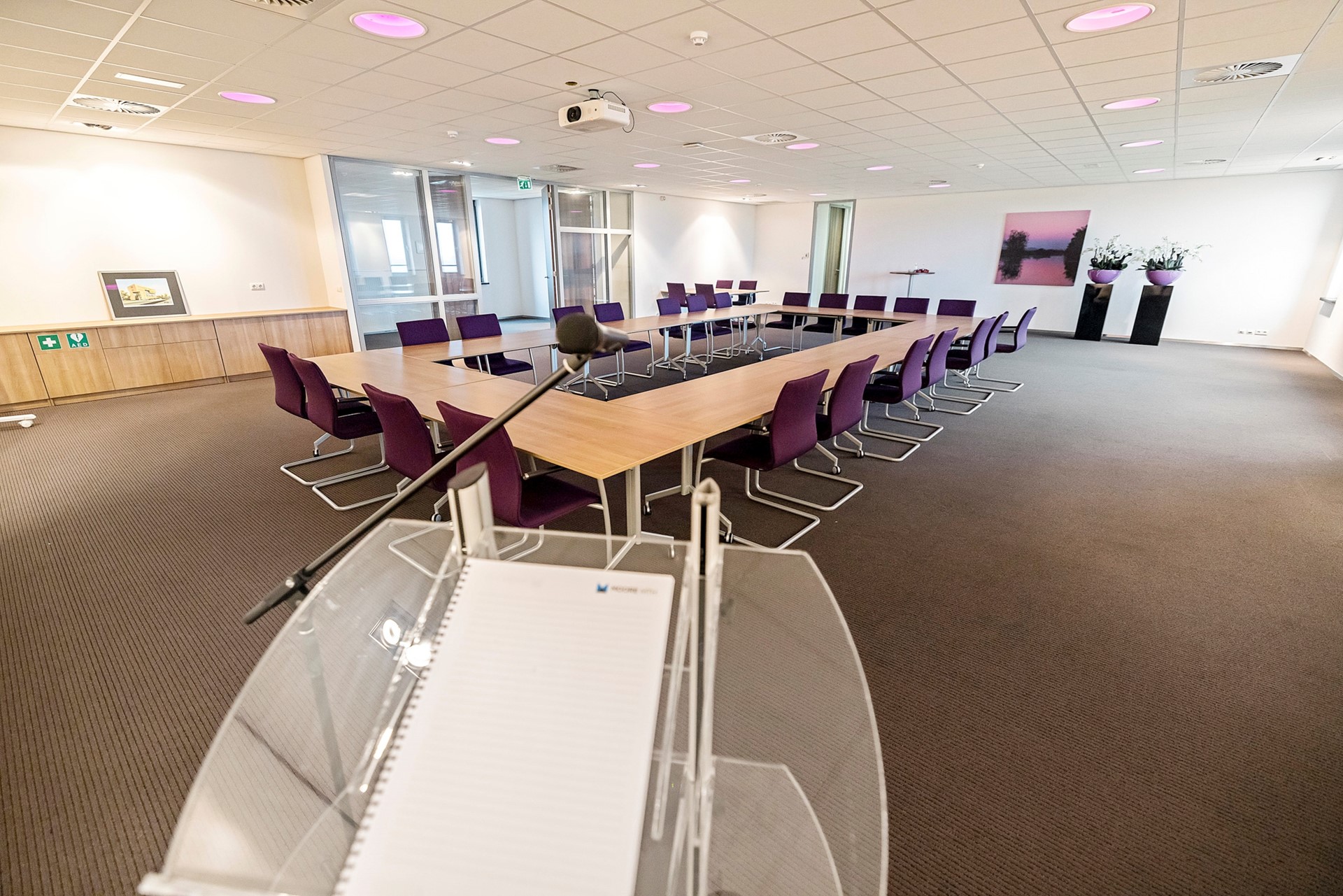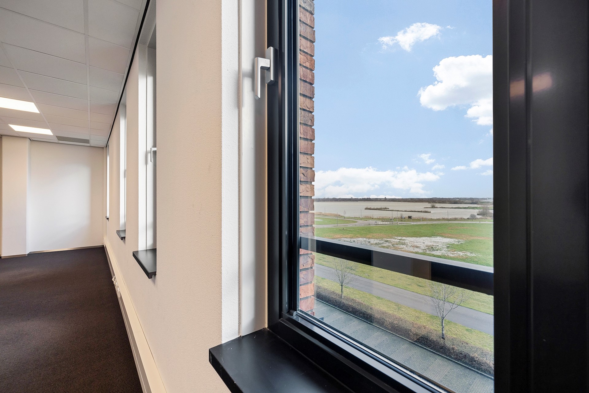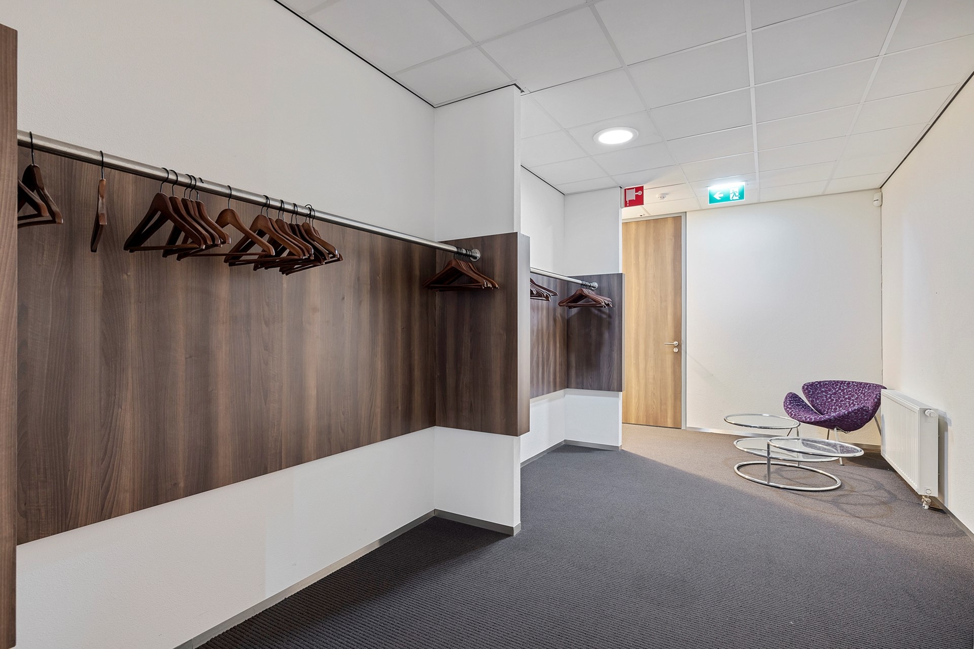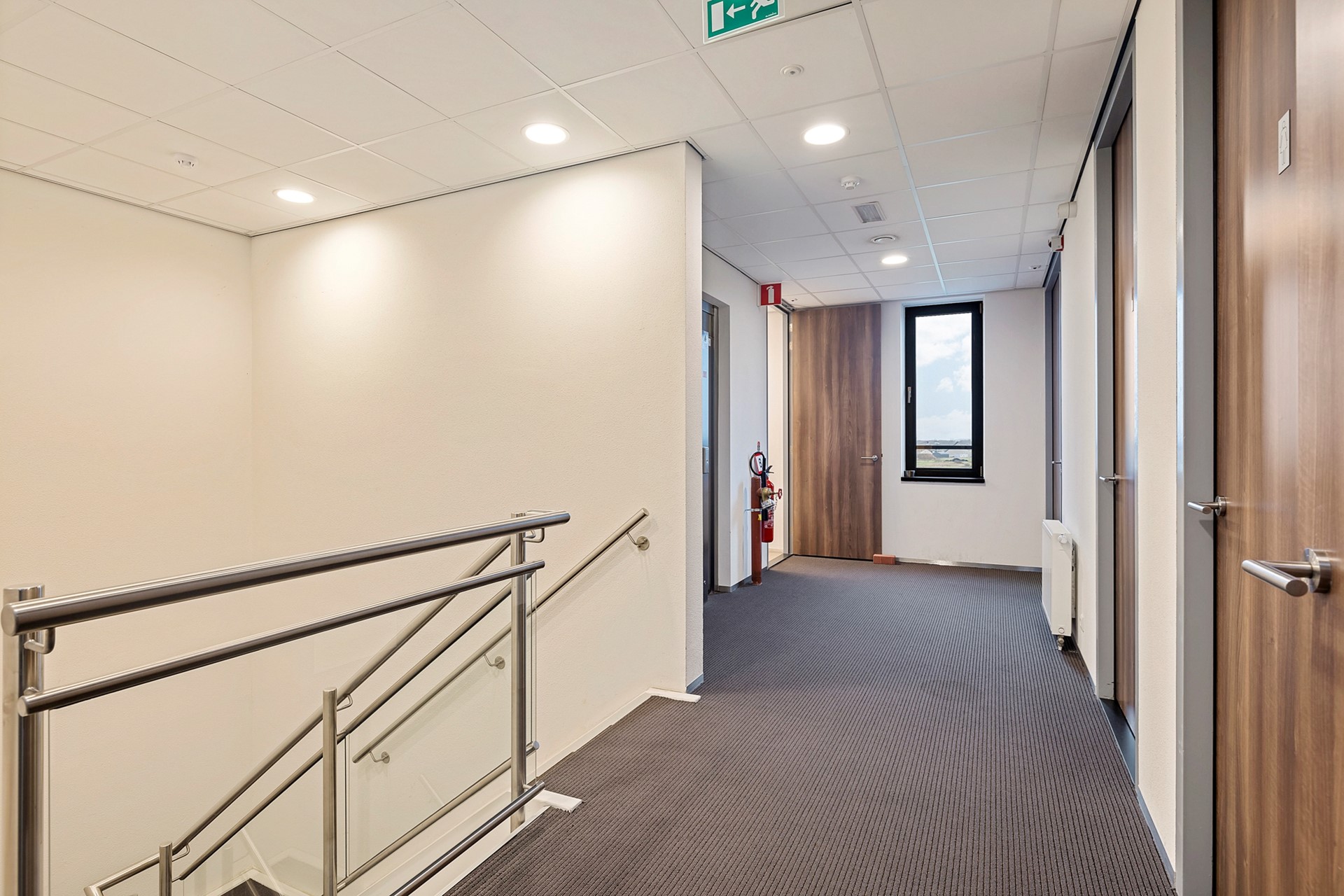 De centrale gang is korter, heeft aan de rechterzijde een viertal kantoren en eindigt eerder met een toegang naar de grote vergaderruimte met royale garderobe. Achter de vergaderruimte bevinden zich twee bergingen t.b.v. de opslag van o.a. tafels en stoelen waardoor de vergaderruimte in meerdere opstellingen kan worden gebruikt.