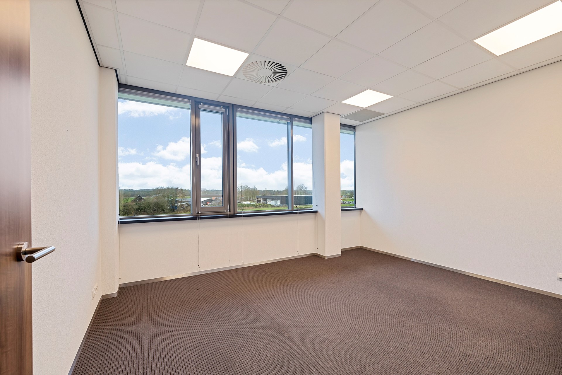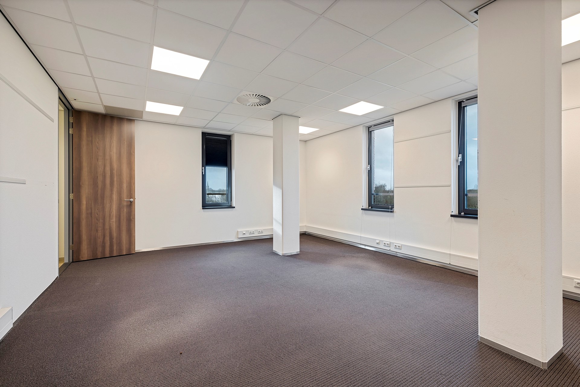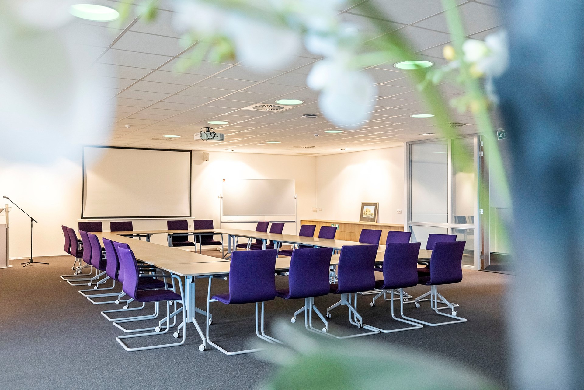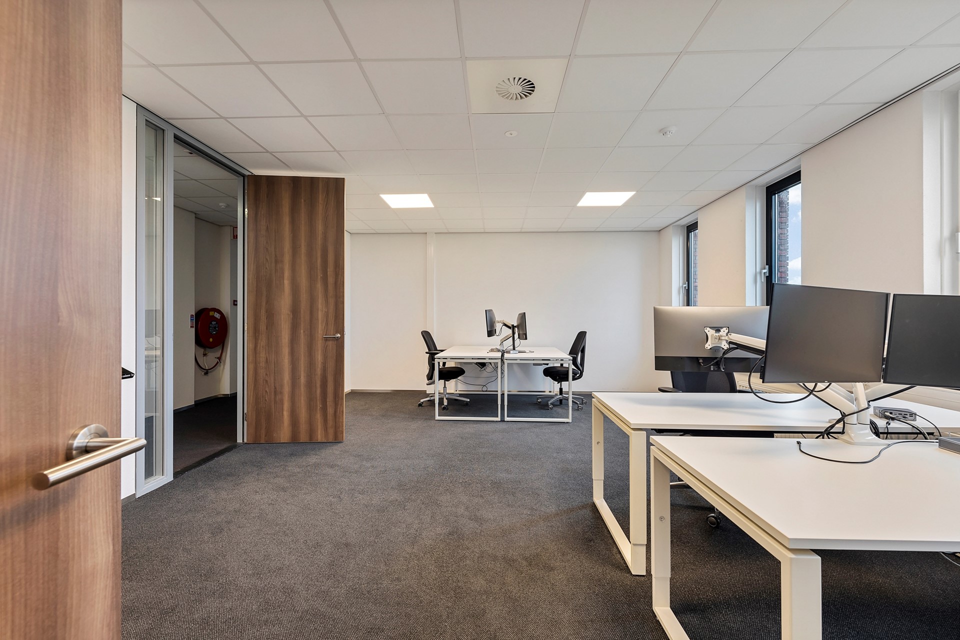 De centrale gang is korter, heeft aan de rechterzijde een viertal kantoren en eindigt eerder met een toegang naar de grote vergaderruimte met royale garderobe. Achter de vergaderruimte bevinden zich twee bergingen t.b.v. de opslag van o.a. tafels en stoelen waardoor de vergaderruimte in meerdere opstellingen kan worden gebruikt.