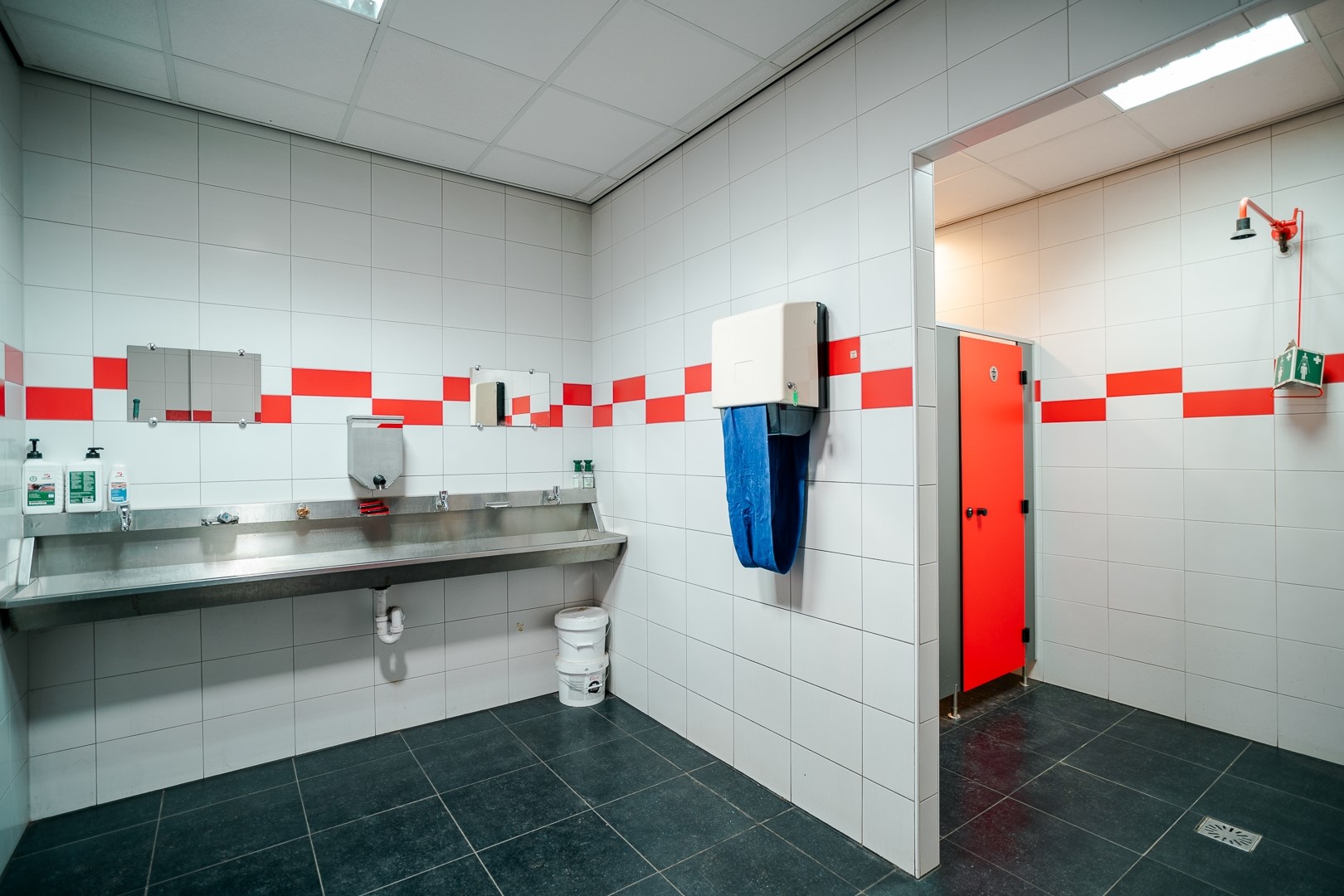 - kantine/ wasruimte ca. 65 m2 (ca. 11.8 x 5.5 meter) met pantry, vloerverwarming, schuifpui naar terras. Wasruimte, 2x toiletten, 2x urinoirs en veiligheid douche.