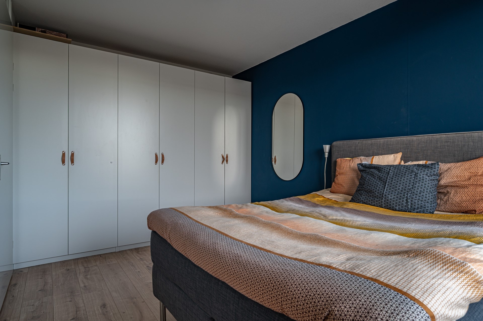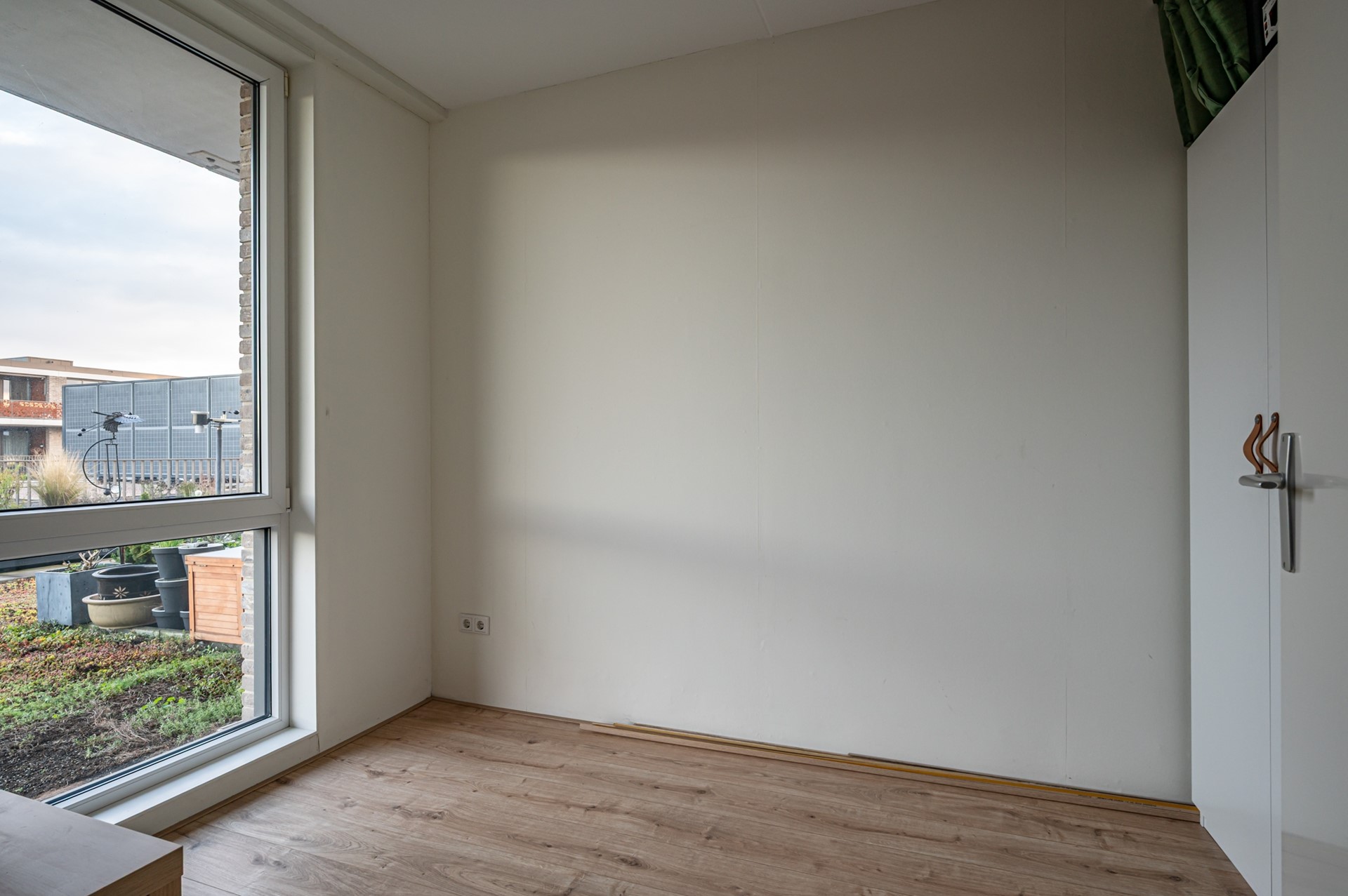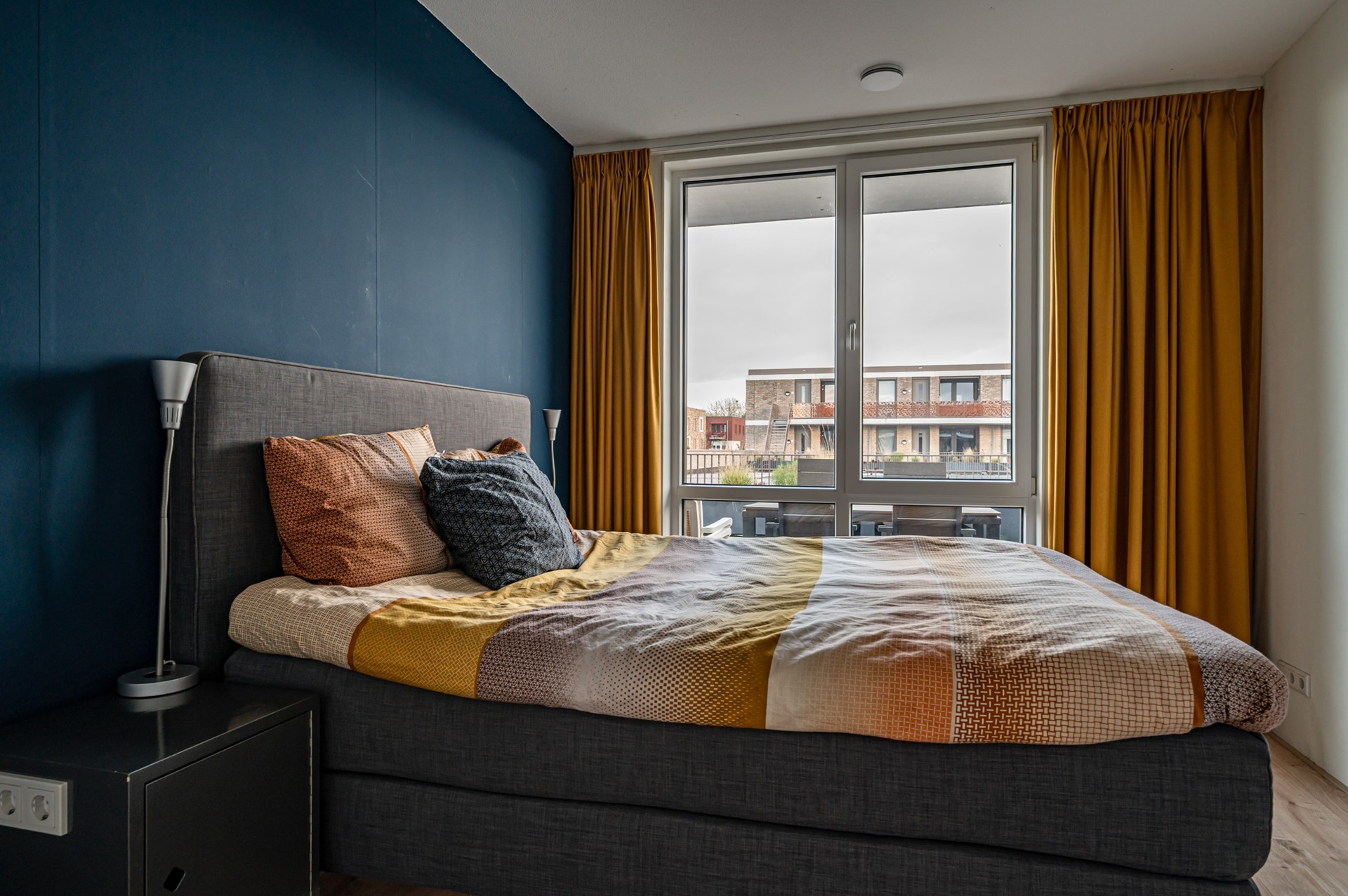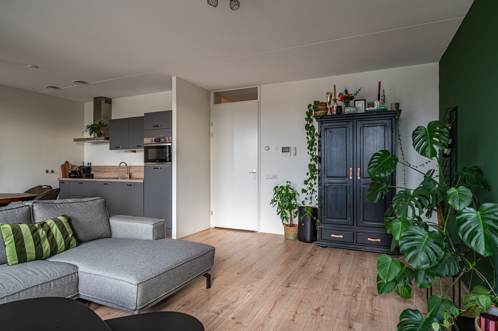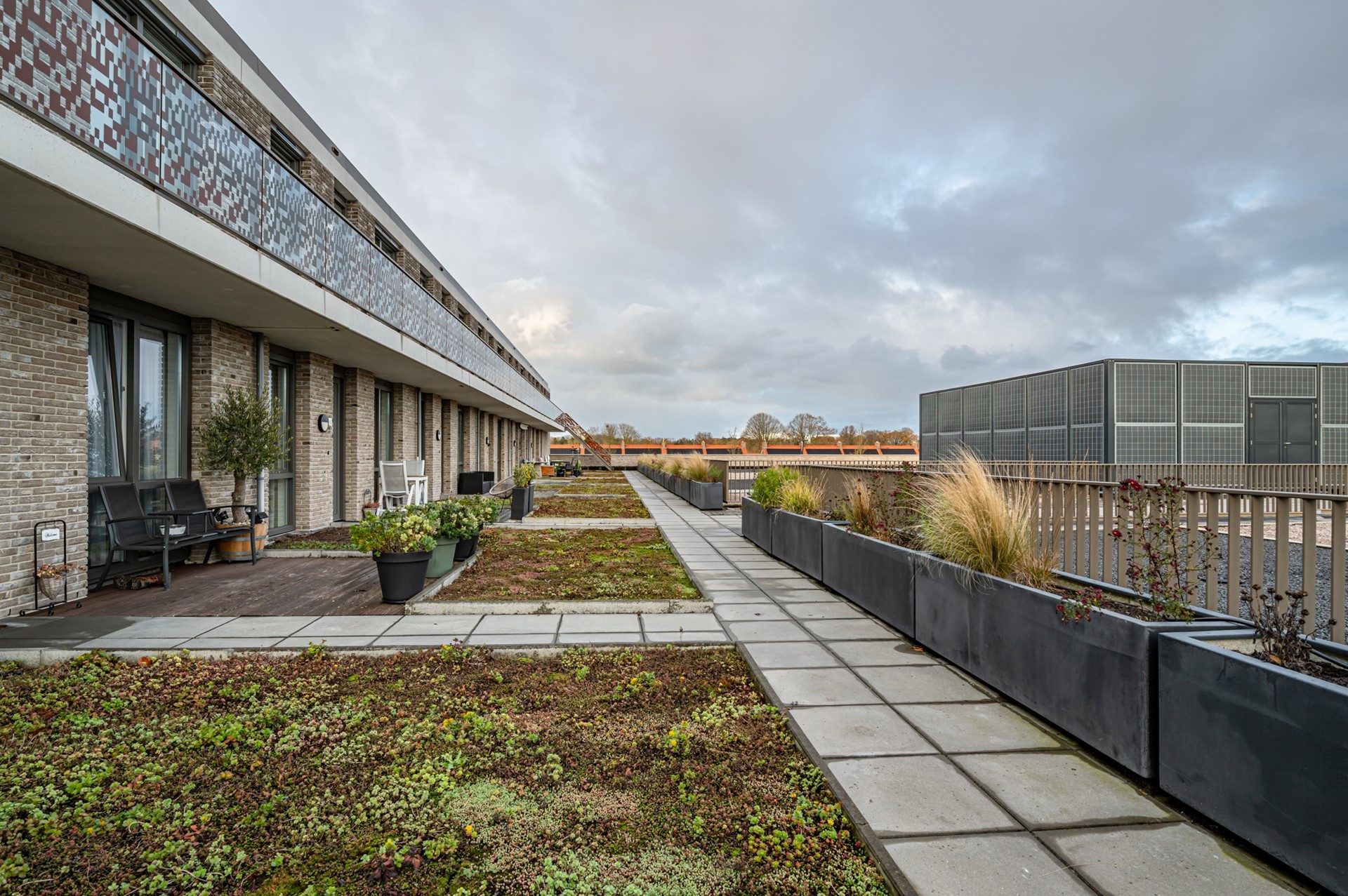 Voorzijde een dakterras/ daktuin. Entree, via de hal bereik je slaapkamer 1 met een kastenwand en slaapkamer 2 met een kastenwand. Daarnaast grenzen aan de hal een meterkast, apart toiletruimte met hangend toilet en fontein, een ruime bijkeuken met de ventilatiewarmtepomp, boiler, witgoedaansluiting en praktische bergruimte, een volledig betegelde badkamer met breed wastafelmeubel v.v. dubbele kraan, designradiator en inloopdouche. Woonkamer met openslaande deur naar deels overdekt balkon op het westen v.v. elektrisch uitvalscherm. De ramen zijn voorzien van elektrische screens. De keuken is v.v. vaatwasser, inductieplaat, koelkast, afzuigkap en combioven. Kortom; van alle gemakken voorzien.