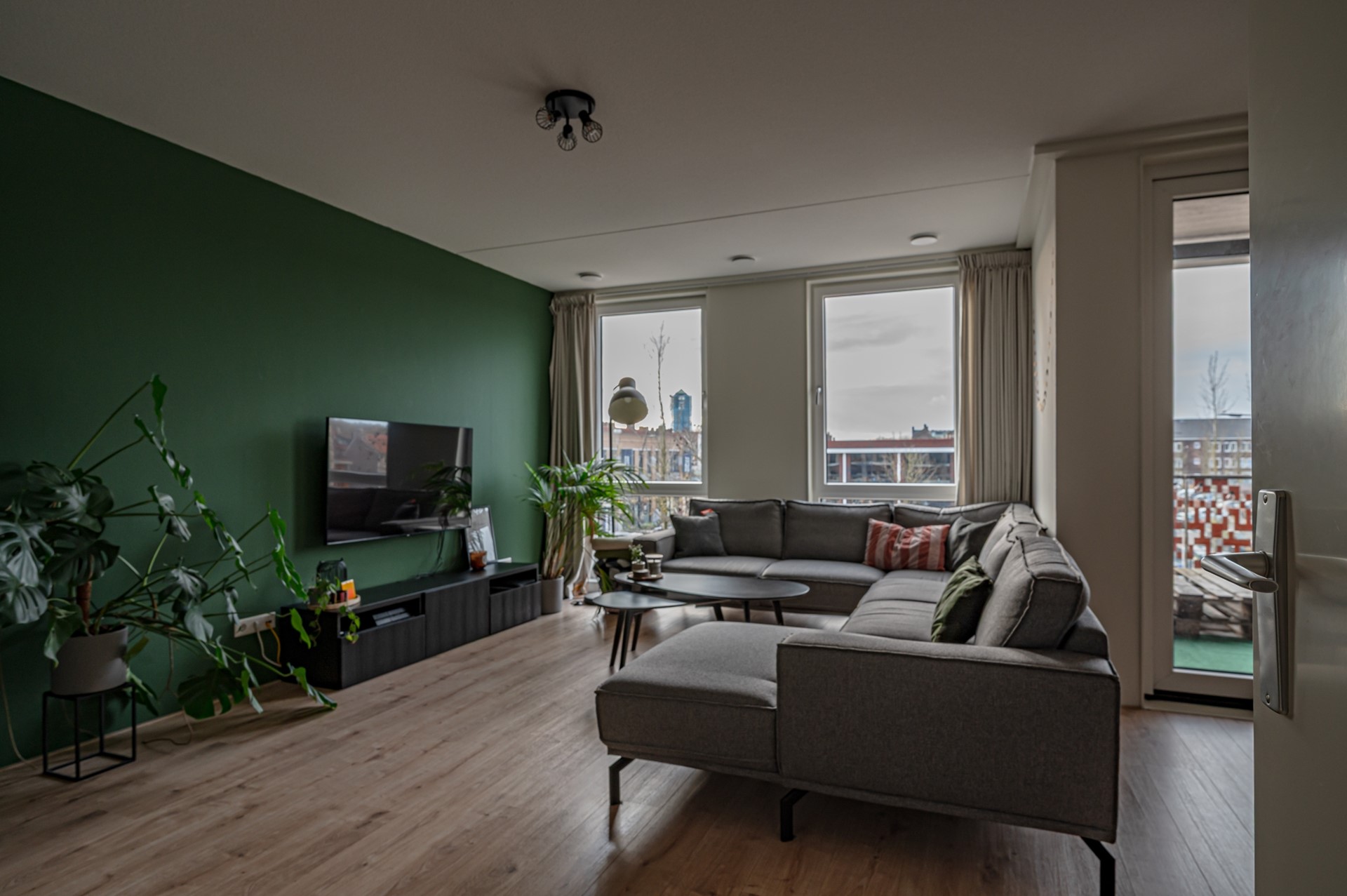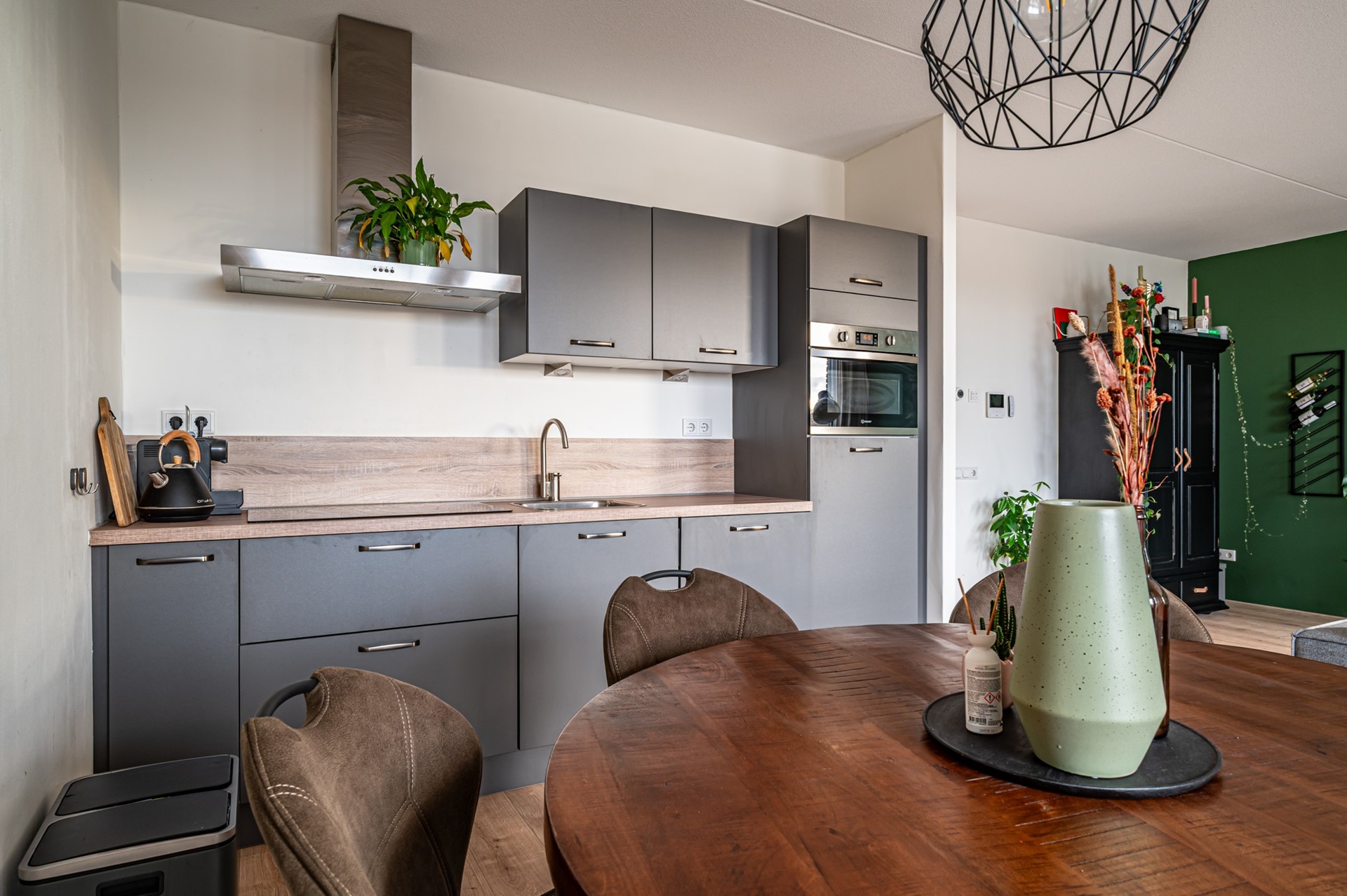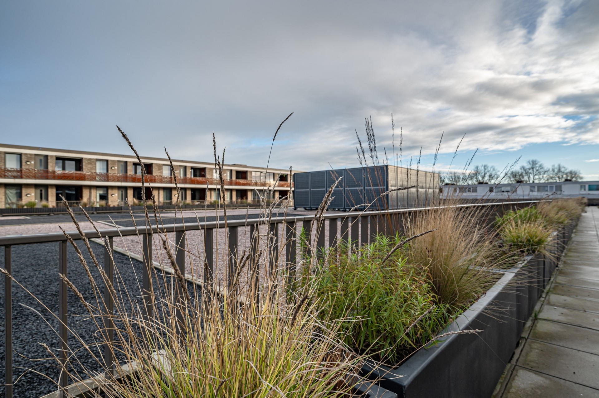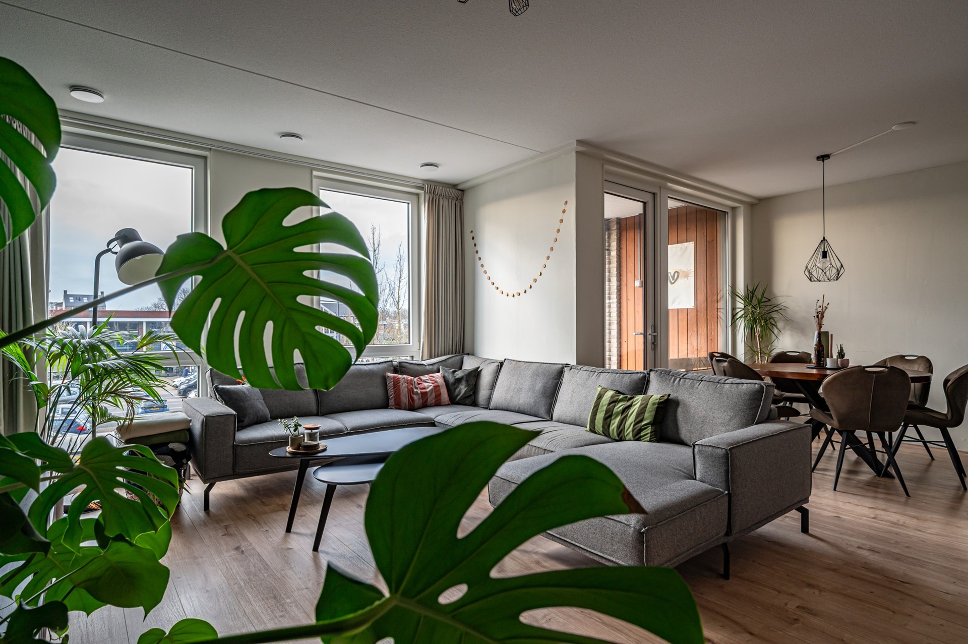 Voorzijde een dakterras/ daktuin. Entree, via de hal bereik je slaapkamer 1 met een kastenwand en slaapkamer 2 met een kastenwand. Daarnaast grenzen aan de hal een meterkast, apart toiletruimte met hangend toilet en fontein, een ruime bijkeuken met de ventilatiewarmtepomp, boiler, witgoedaansluiting en praktische bergruimte, een volledig betegelde badkamer met breed wastafelmeubel v.v. dubbele kraan, designradiator en inloopdouche. Woonkamer met openslaande deur naar deels overdekt balkon op het westen v.v. elektrisch uitvalscherm. De ramen zijn voorzien van elektrische screens. De keuken is v.v. vaatwasser, inductieplaat, koelkast, afzuigkap en combioven. Kortom; van alle gemakken voorzien.