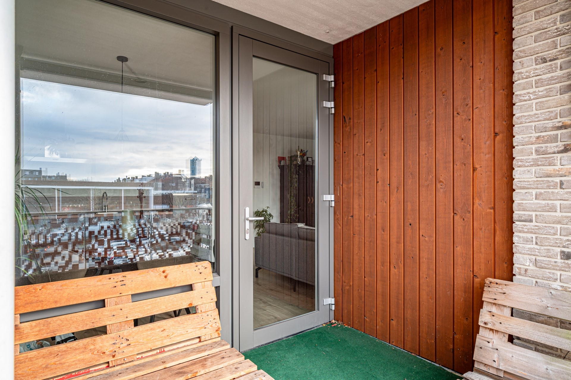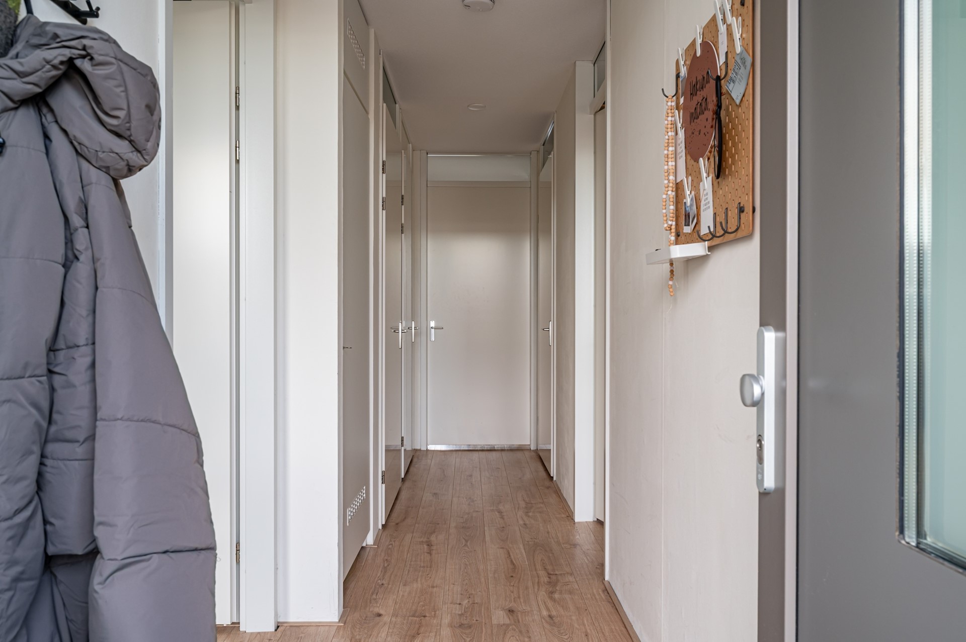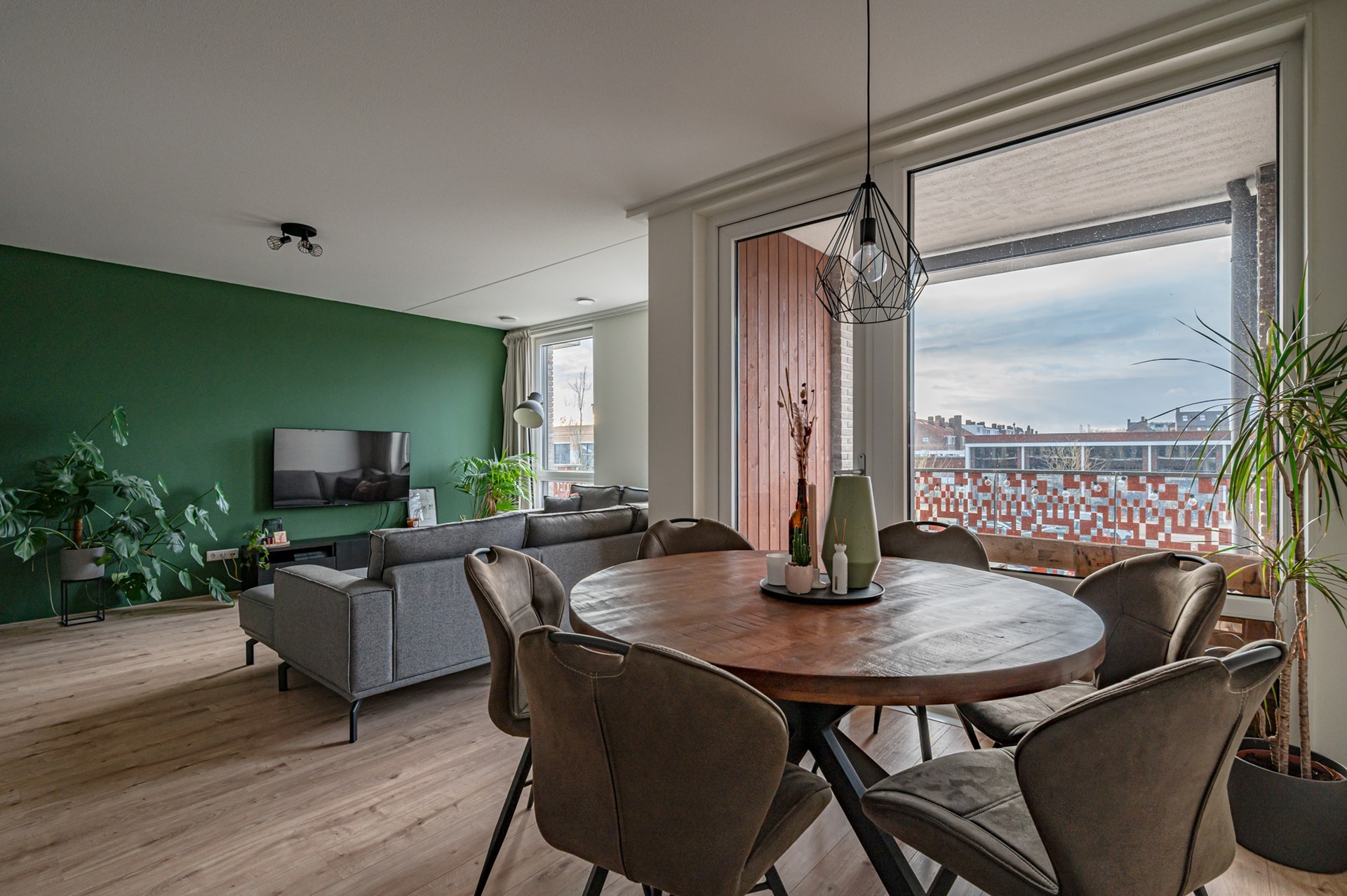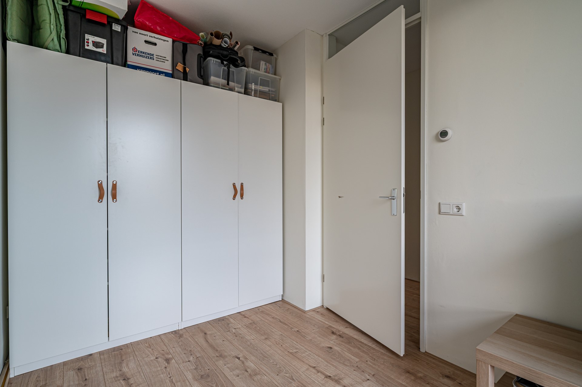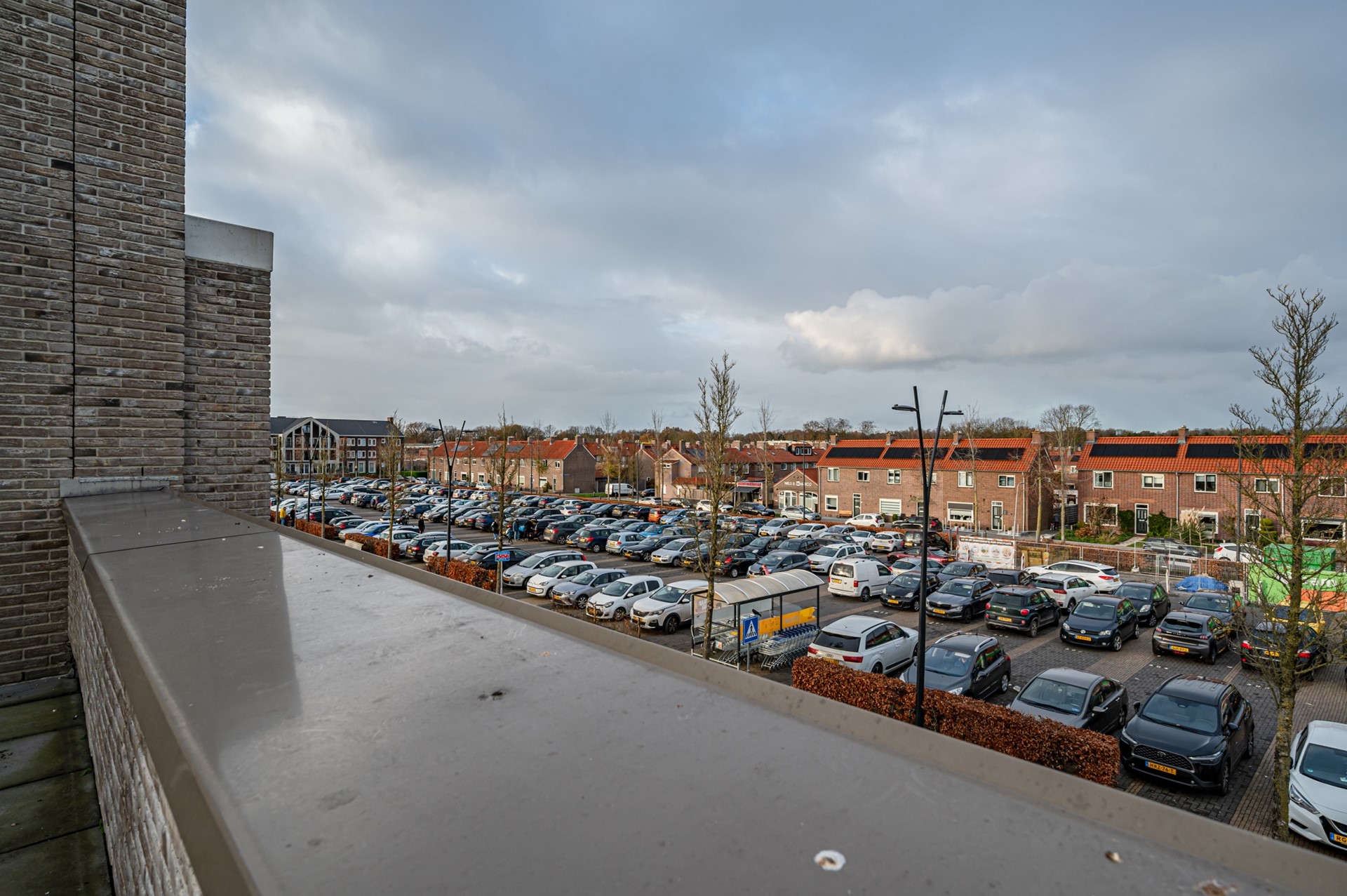 Voorzijde een dakterras/ daktuin. Entree, via de hal bereik je slaapkamer 1 met een kastenwand en slaapkamer 2 met een kastenwand. Daarnaast grenzen aan de hal een meterkast, apart toiletruimte met hangend toilet en fontein, een ruime bijkeuken met de ventilatiewarmtepomp, boiler, witgoedaansluiting en praktische bergruimte, een volledig betegelde badkamer met breed wastafelmeubel v.v. dubbele kraan, designradiator en inloopdouche. Woonkamer met openslaande deur naar deels overdekt balkon op het westen v.v. elektrisch uitvalscherm. De ramen zijn voorzien van elektrische screens. De keuken is v.v. vaatwasser, inductieplaat, koelkast, afzuigkap en combioven. Kortom; van alle gemakken voorzien.