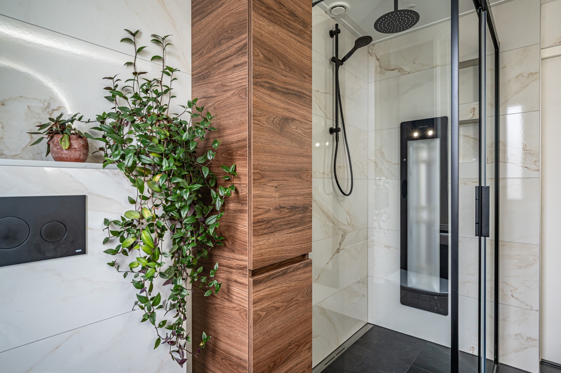 Luxe badkamer met inloopdouche, regendouche, Sunshower, tweede toilet, wastafelmeubel, designradiator en inbouwspots.