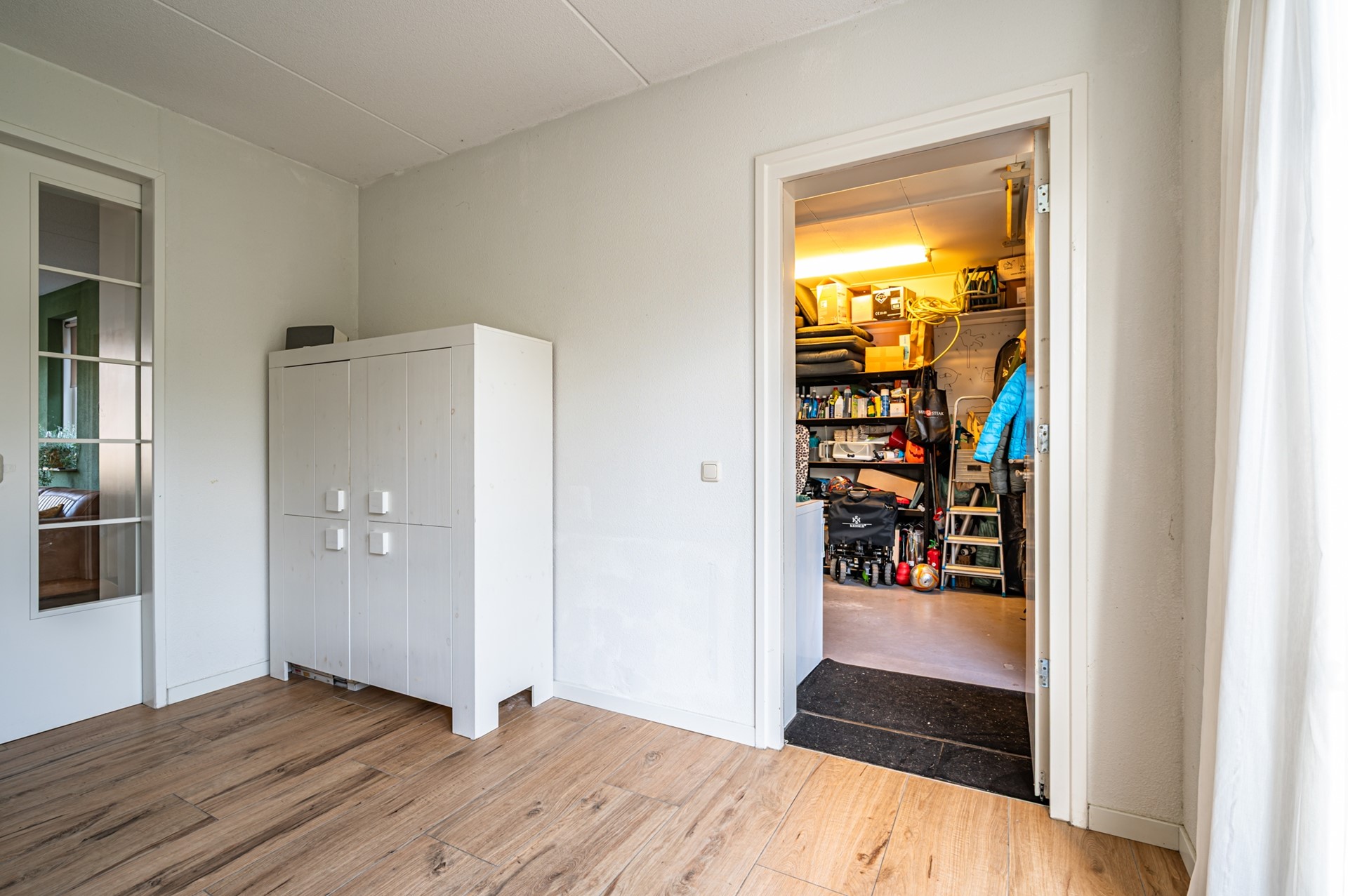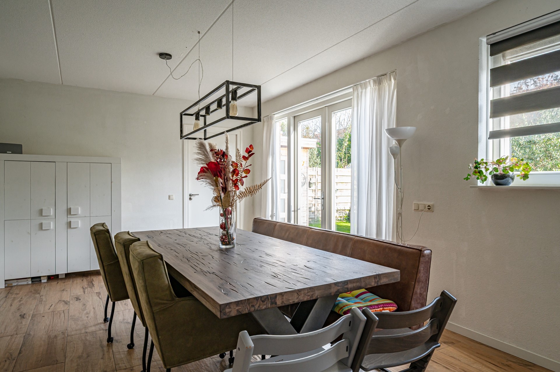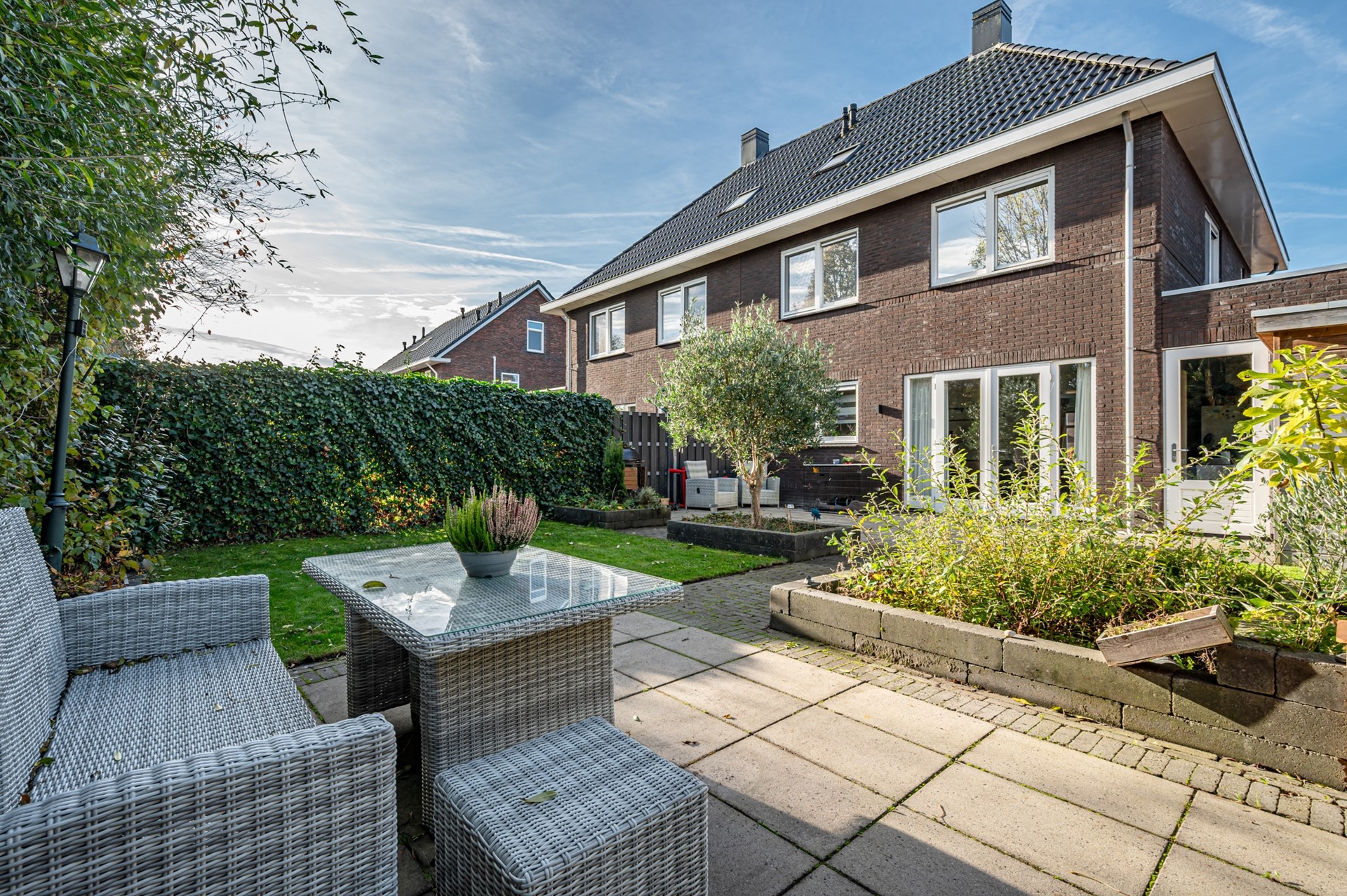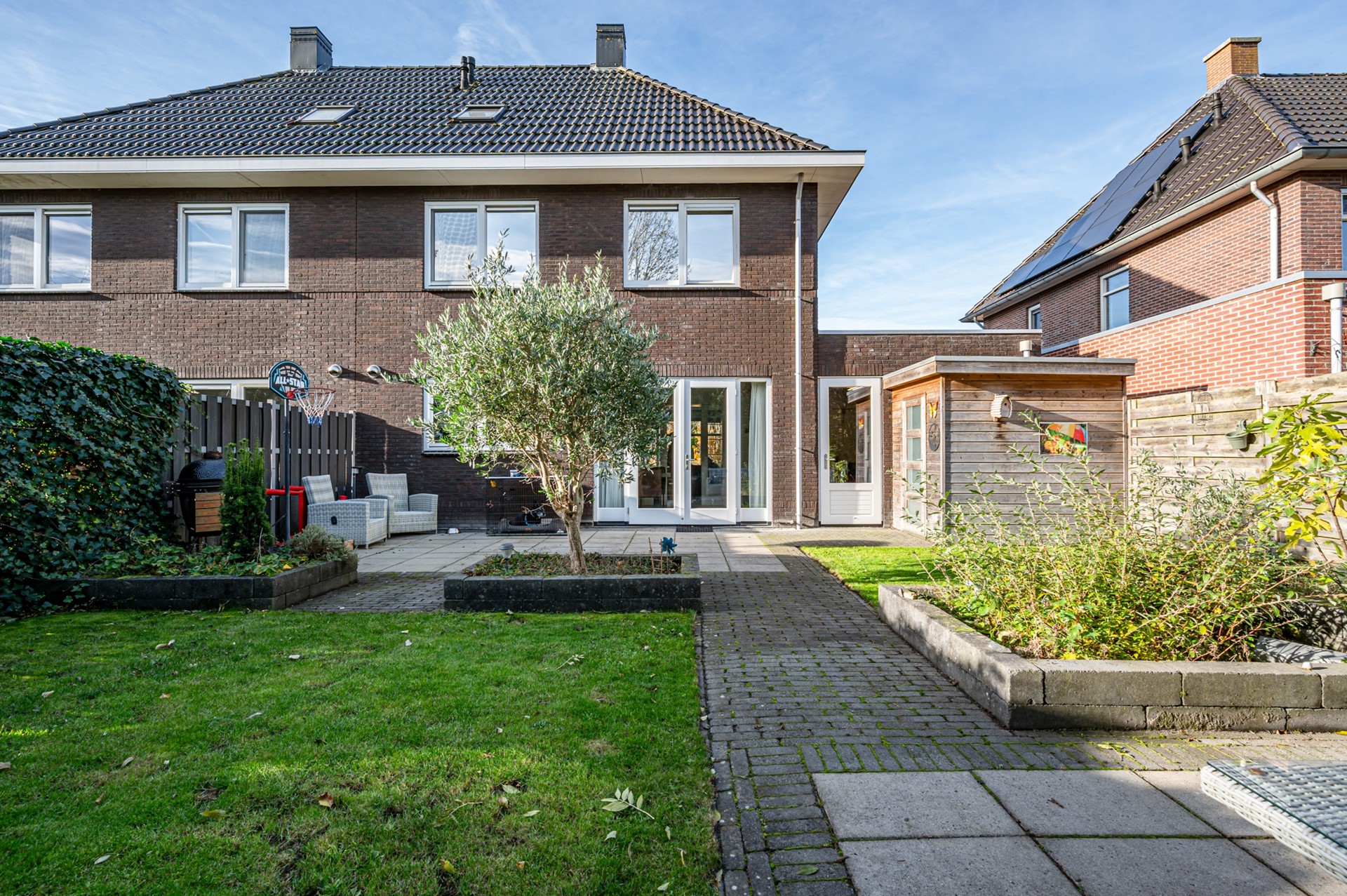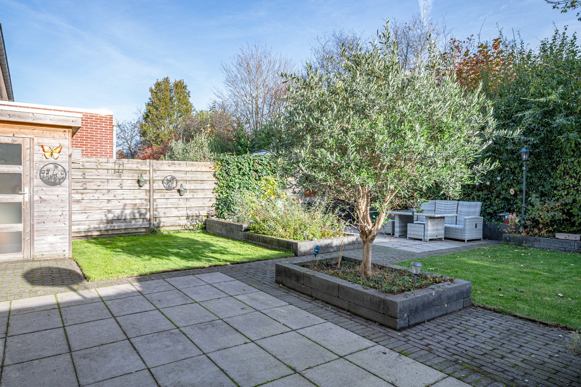 Openslaande deuren brengen u naar de zonnige achtertuin, waar het op ieder moment van de dag in de zomer heerlijk vertoeven is. Vanuit de keuken bereikt u tevens de aangebouwde garage.