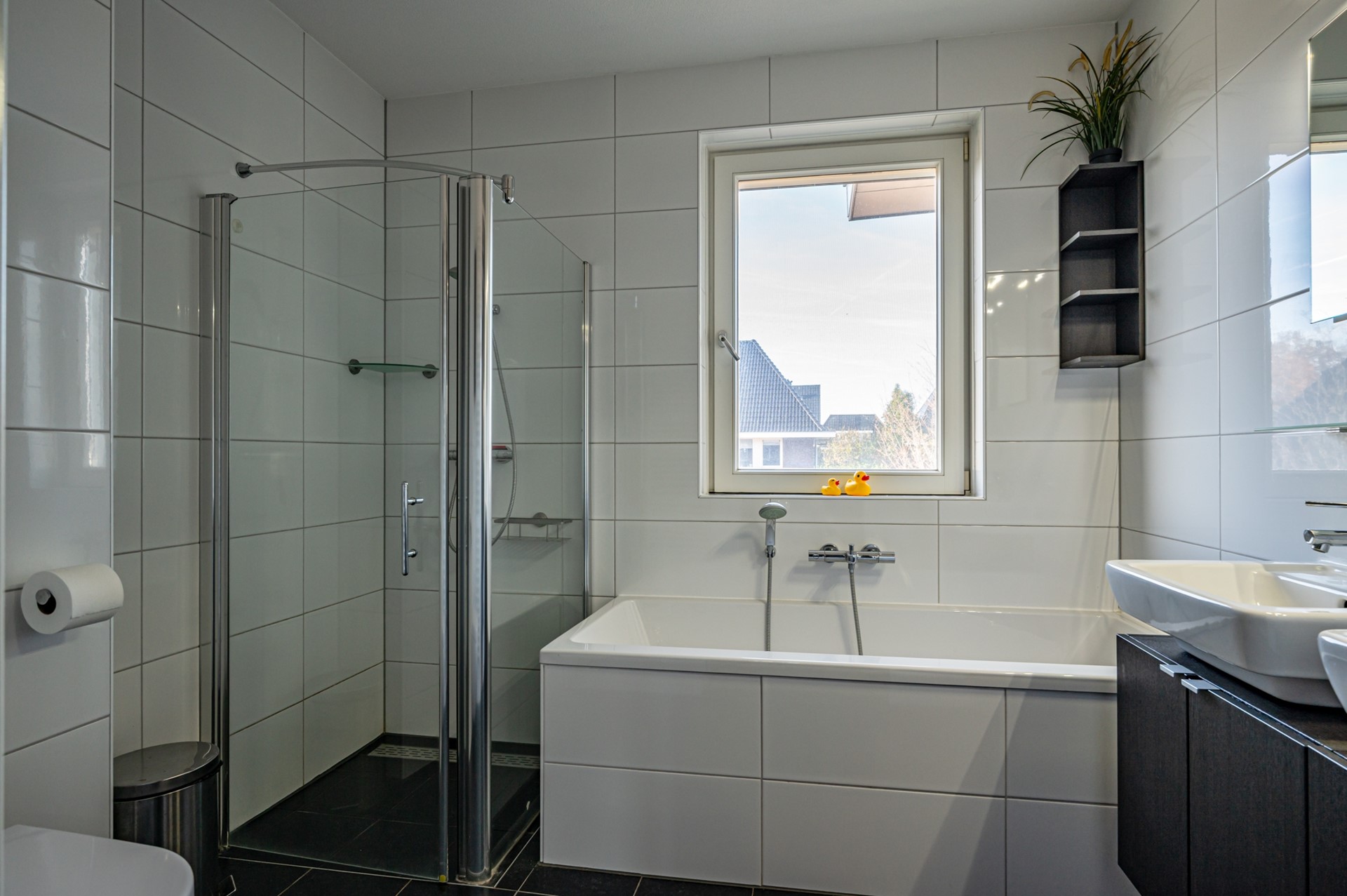 De moderne badkamer is volledig betegeld en beschikt over een douchecabine, een groot ligbad, dubbele wastafel, toilet en designradiator.