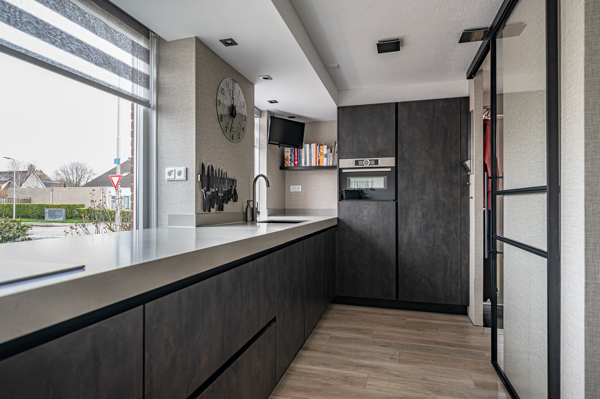 Via een moderne aluminium schuifdeur bereikt u de luxe keuken (ca. 2021). Deze keuken is stijlvol uitgevoerd en voorzien van diverse ruime lades en hoogwaardige inbouwapparatuur, waaronder een inductiekookplaat, afzuigkap, boiler, combi-oven, koelkast en een fraai stenen werkblad.