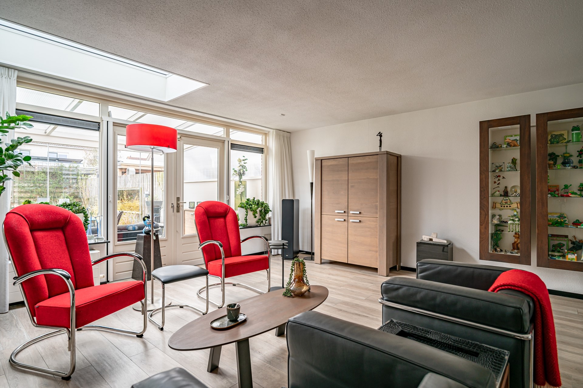 De uitgebouwde woonkamer is een heerlijke leefruimte met veel lichtinval en een sfeervolle gashaard. De lichtstraat (ca. 2025) met elektrisch zonnescherm zorgt voor extra daglicht. Via openslaande tuindeuren bereikt u de serre.