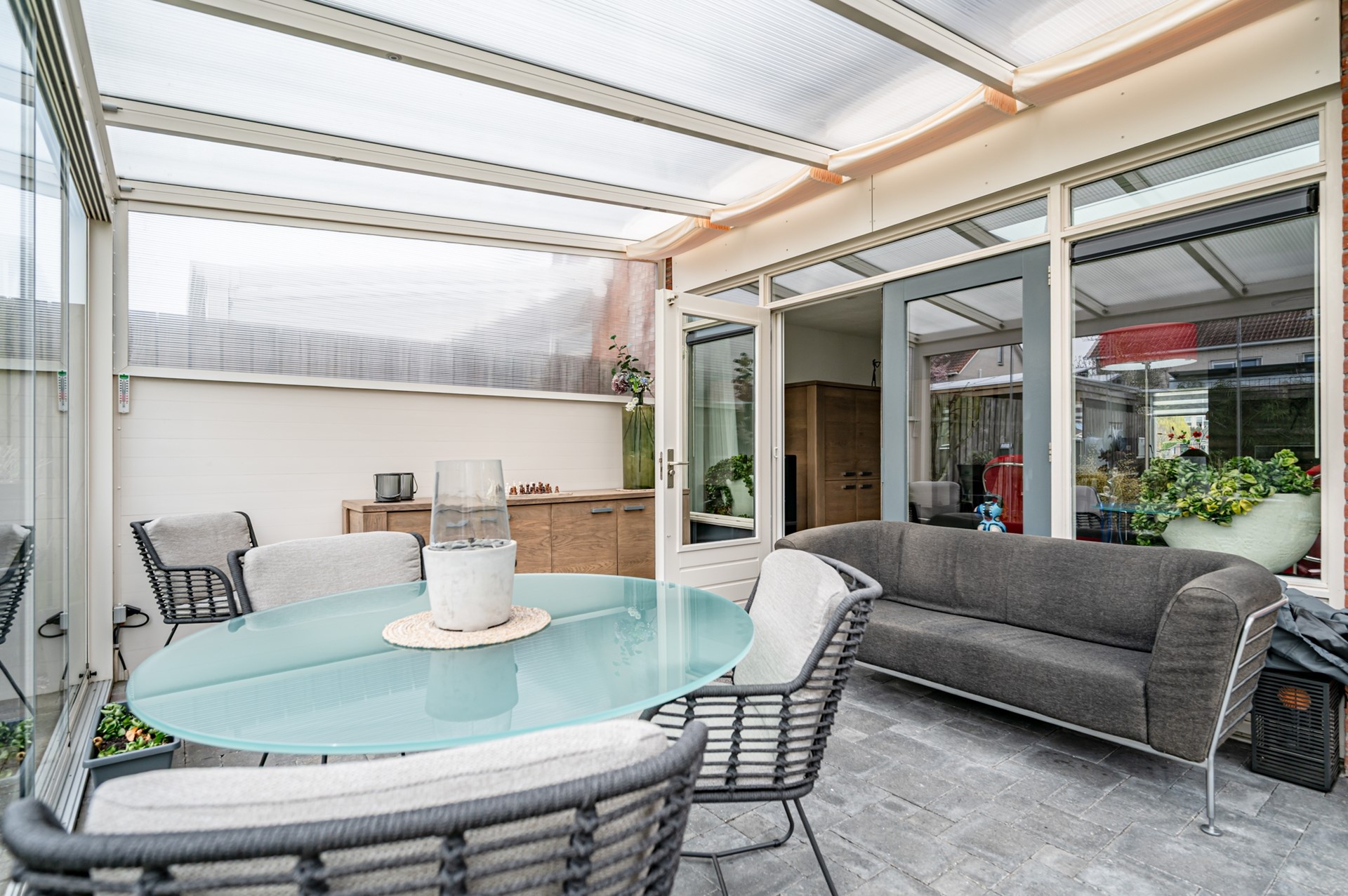 • Aangebouwde aluminium serre met glazen schuifwanden
