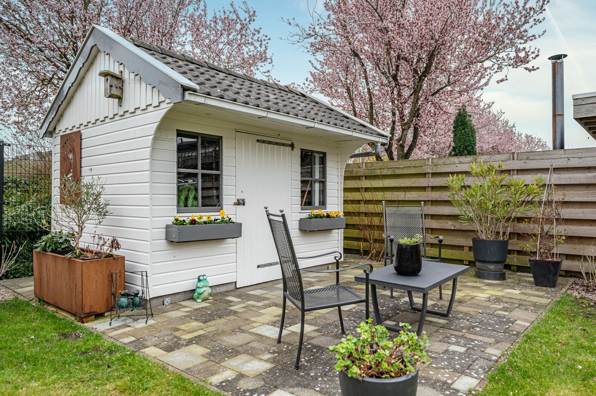 De achtertuin op het zuiden is ruim en verzorgd aangelegd met meerdere terrassen, groen en een tuinhuis. Dankzij de gunstige ligging kunt u hier optimaal van de zon genieten.