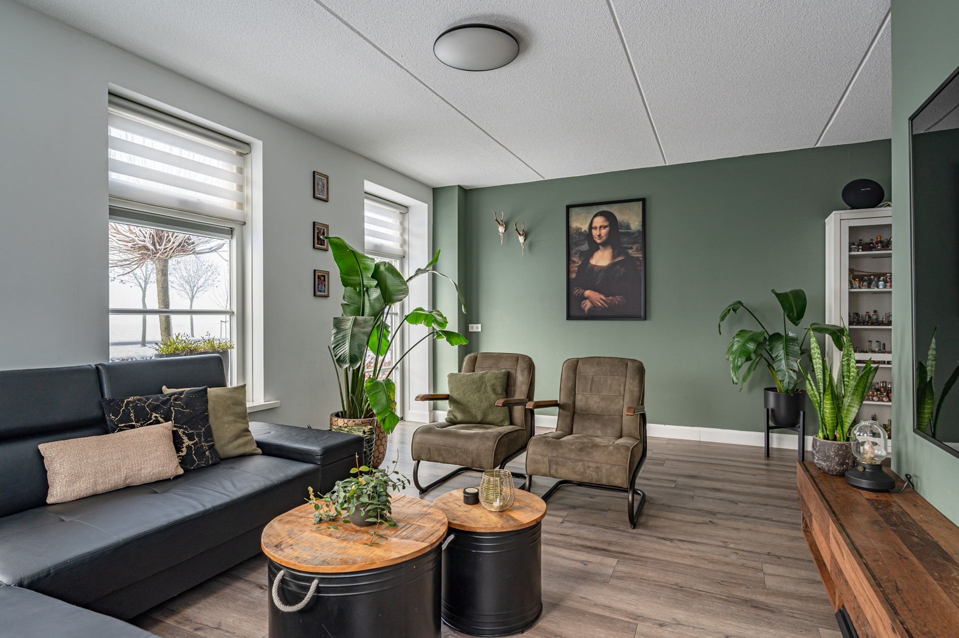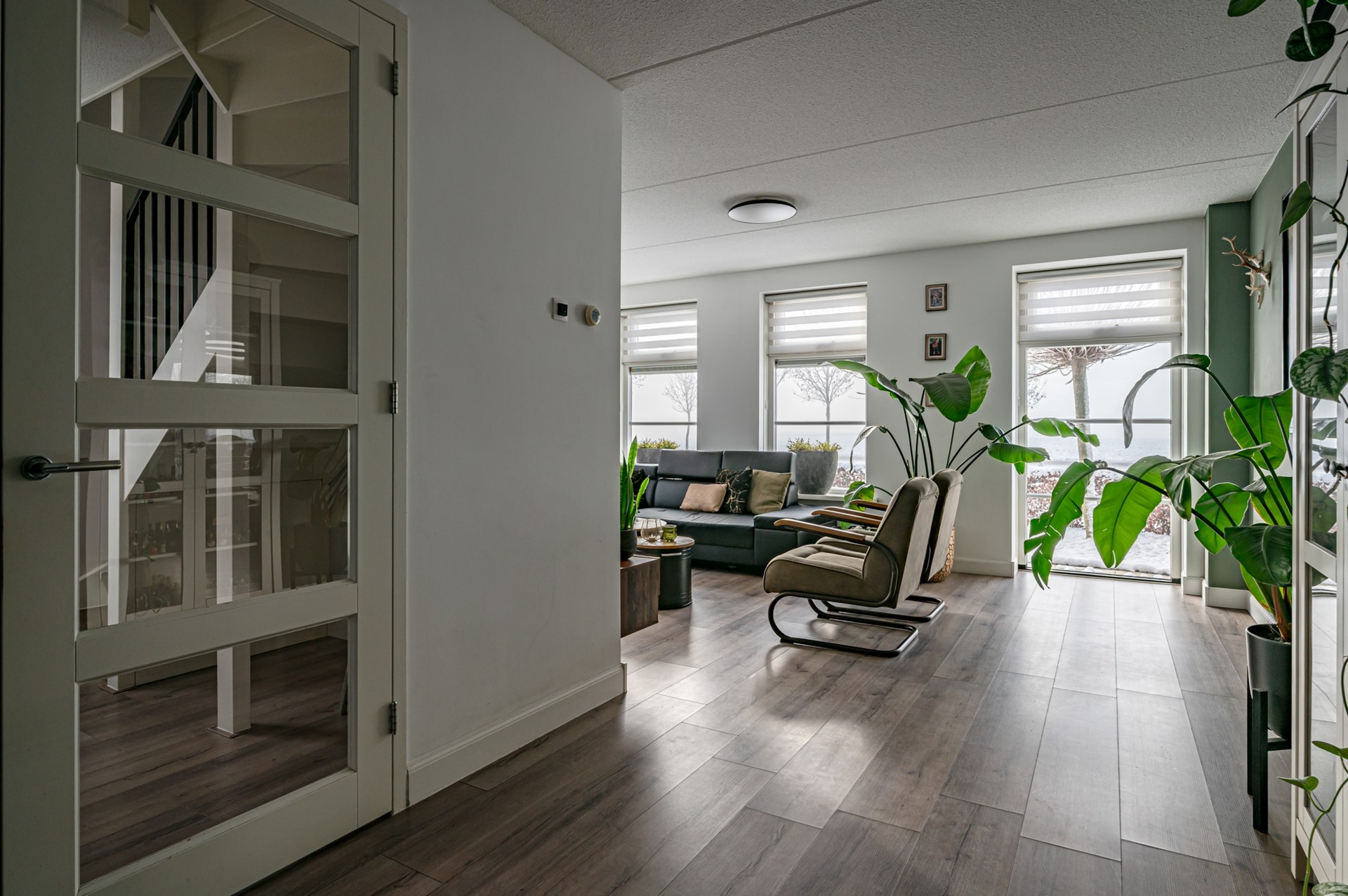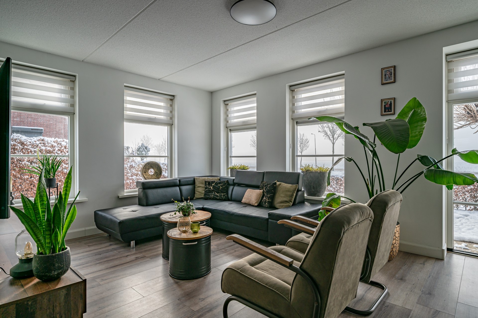 • Ruime L-vormige straatgerichte woonkamer met veel raampartijen, lichte laminaatvloer met vloerverwarming.