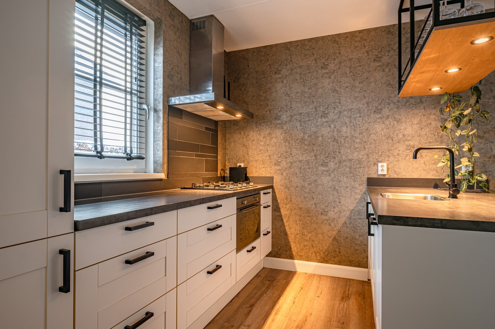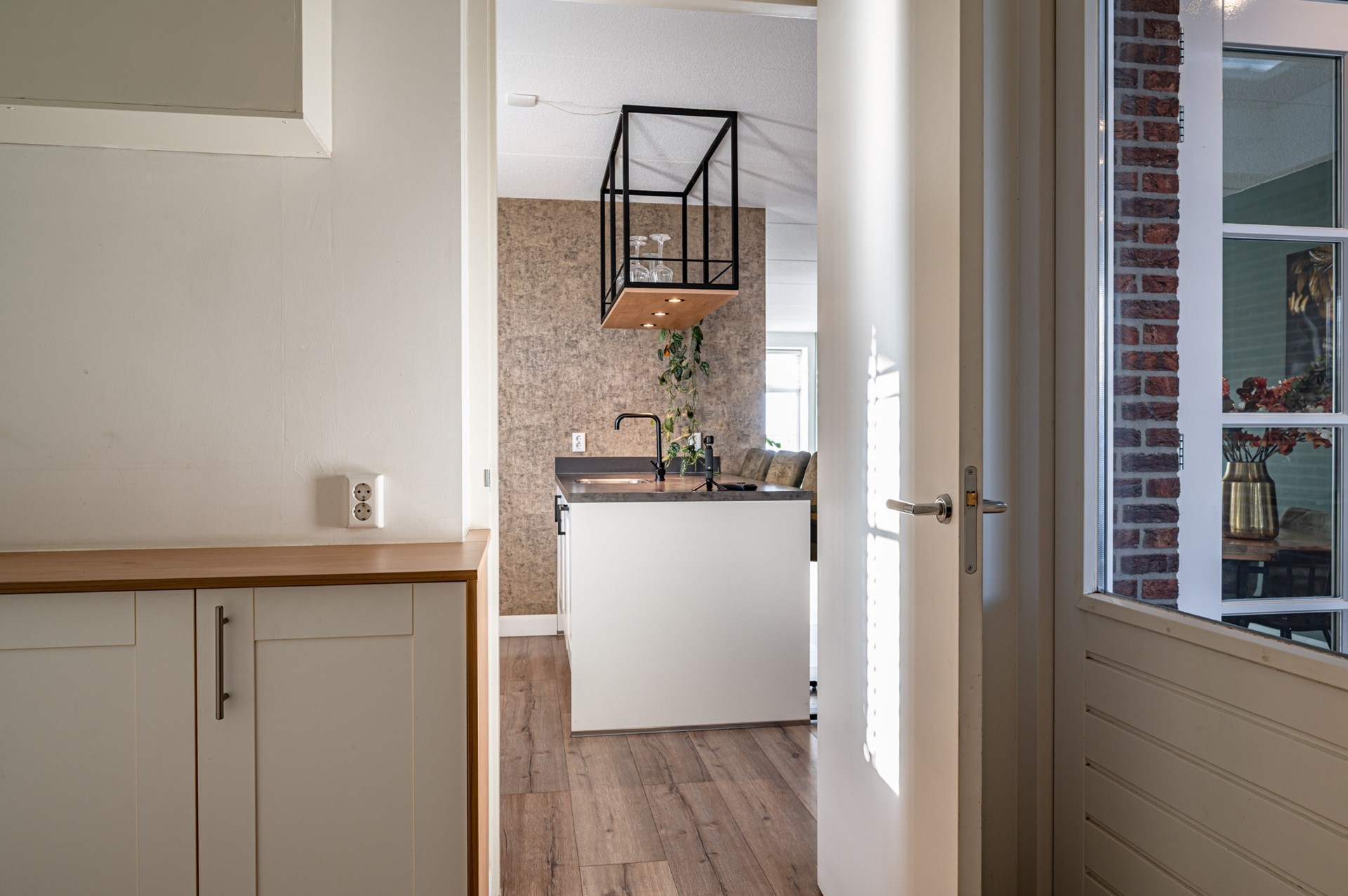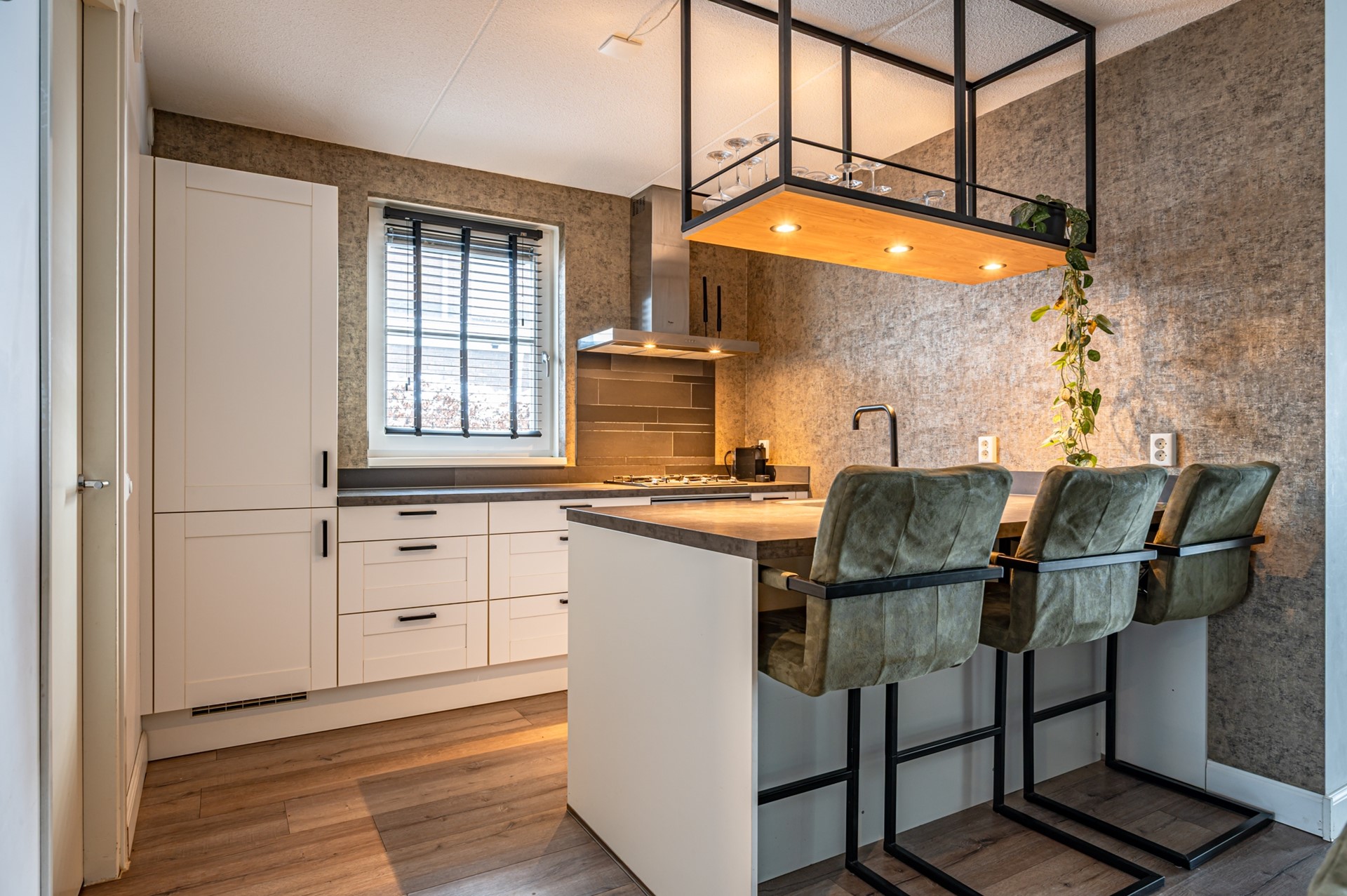 • Woonkeuken met vloerverwarming, openslaande tuindeuren en schiereiland. Voorzien van moderne inbouwapparatuur: koel/vriescombinatie, combi-oven, vaatwasser (2025), 4-pits gaskookplaat en rvs-afzuigkap.