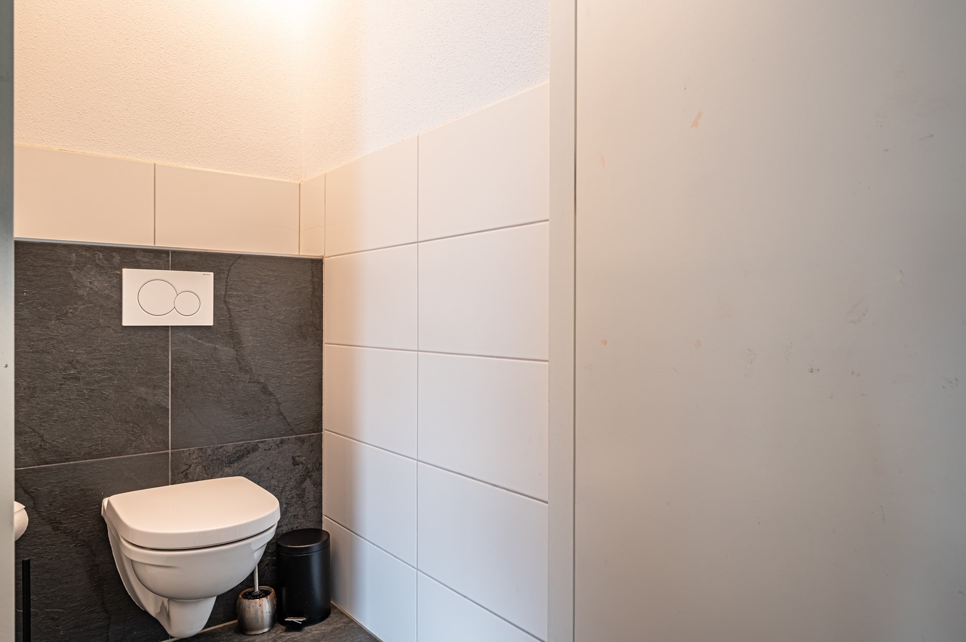 • Praktische bijkeuken met witgoedaansluitingen en kast met schuifdeuren. Hier is het toilet welke gedeeltelijk is betegeld. Deur naar de overkapping en achtertuin.