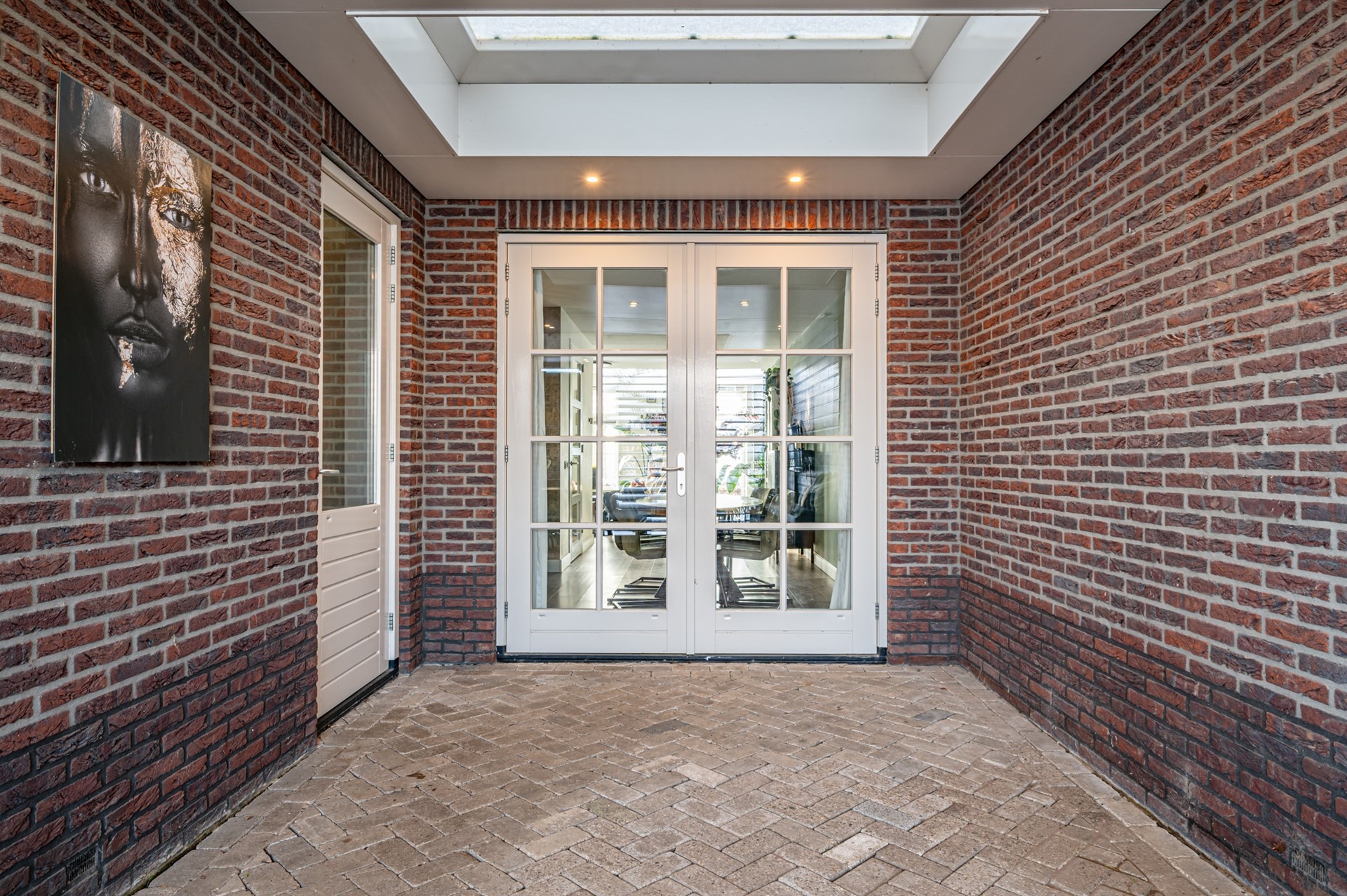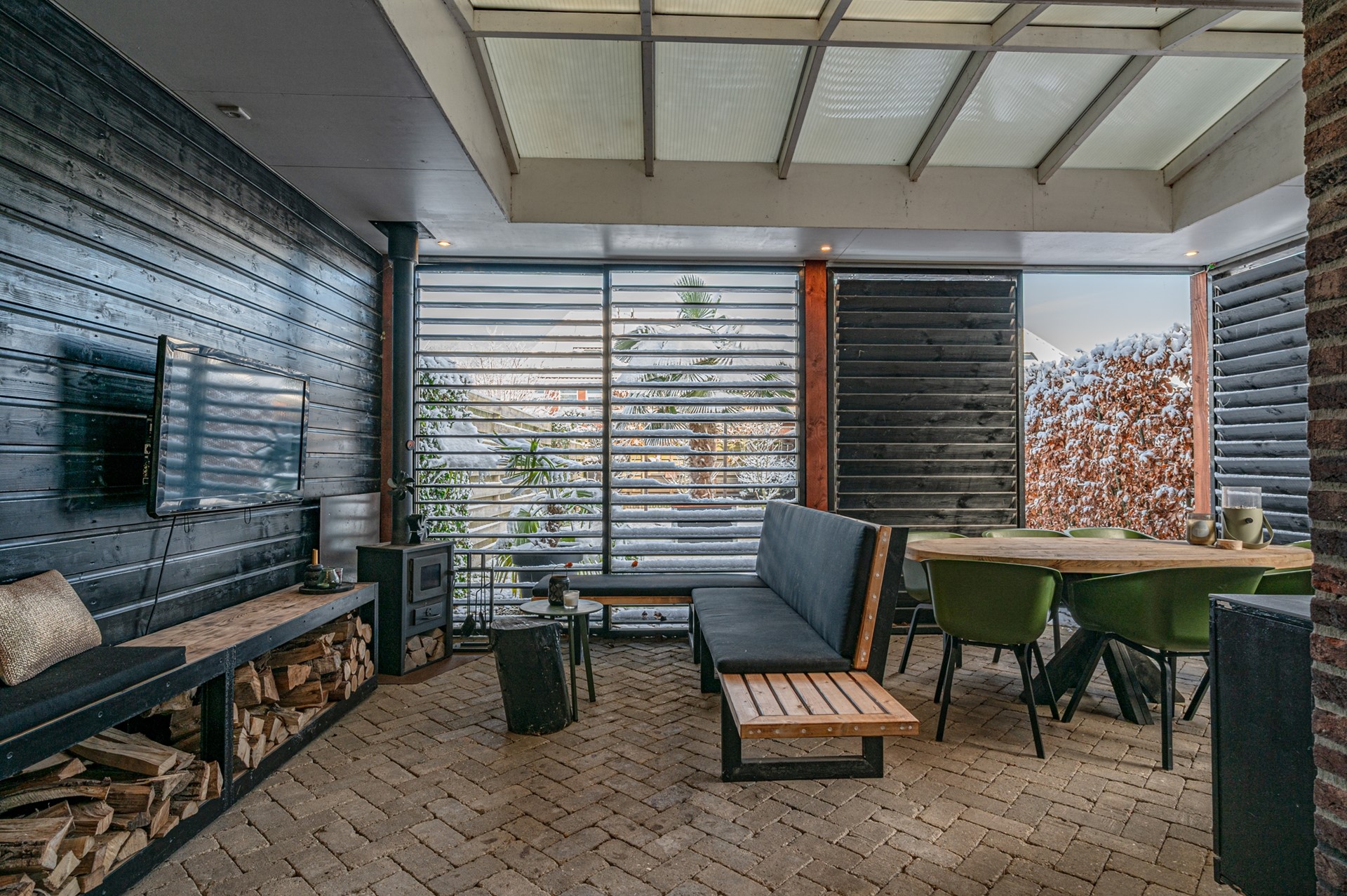 • Riante aangebouwde overkapping v.v. houtkachel, lichtkoepel en lichtstraat voor extra daglicht. Geheel is af te sluiten via lamelschuifpanelen.