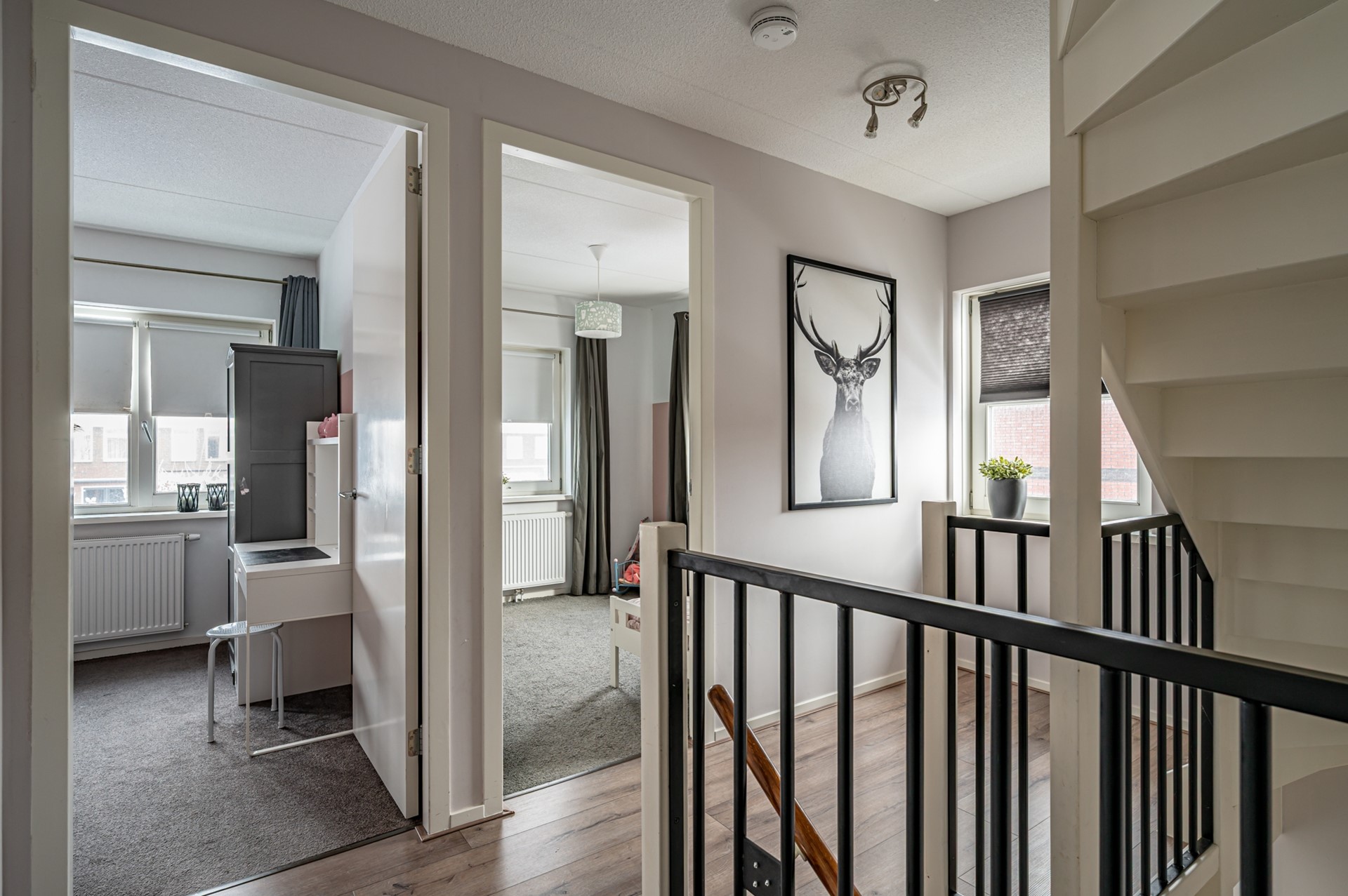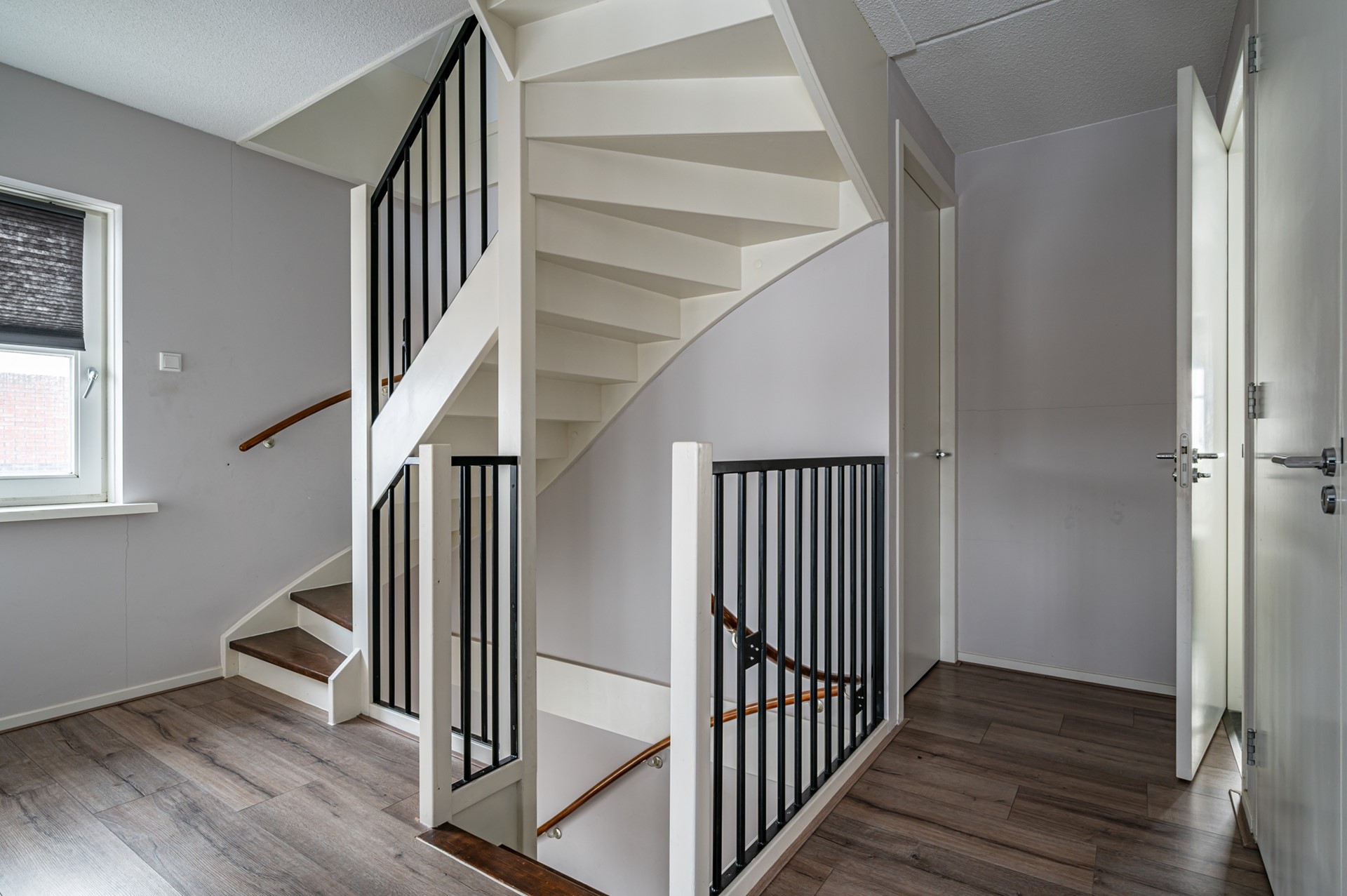 • Overloop met laminaatvloer, vaste trap naar de tweede verdieping en een inloopkast.