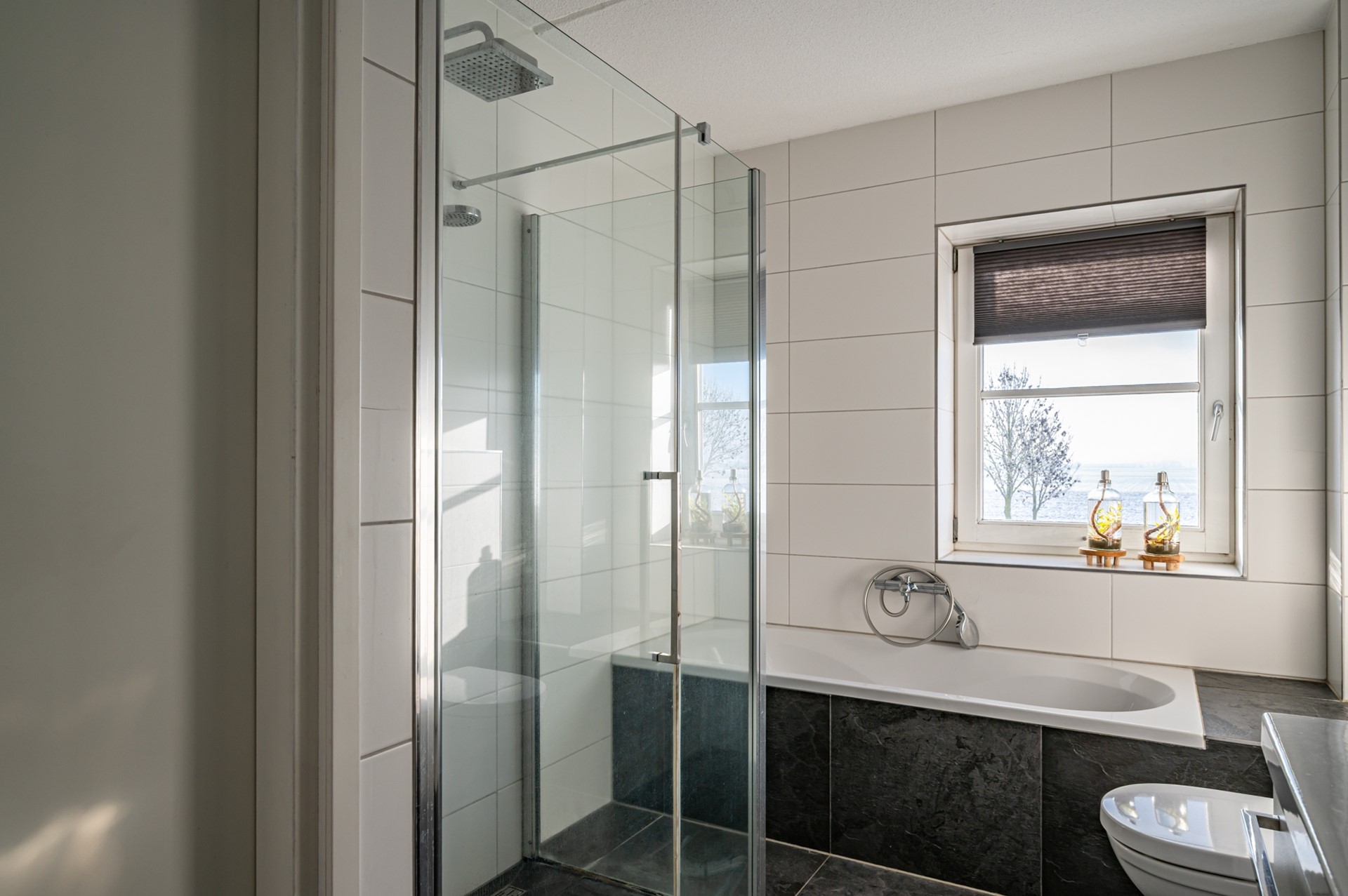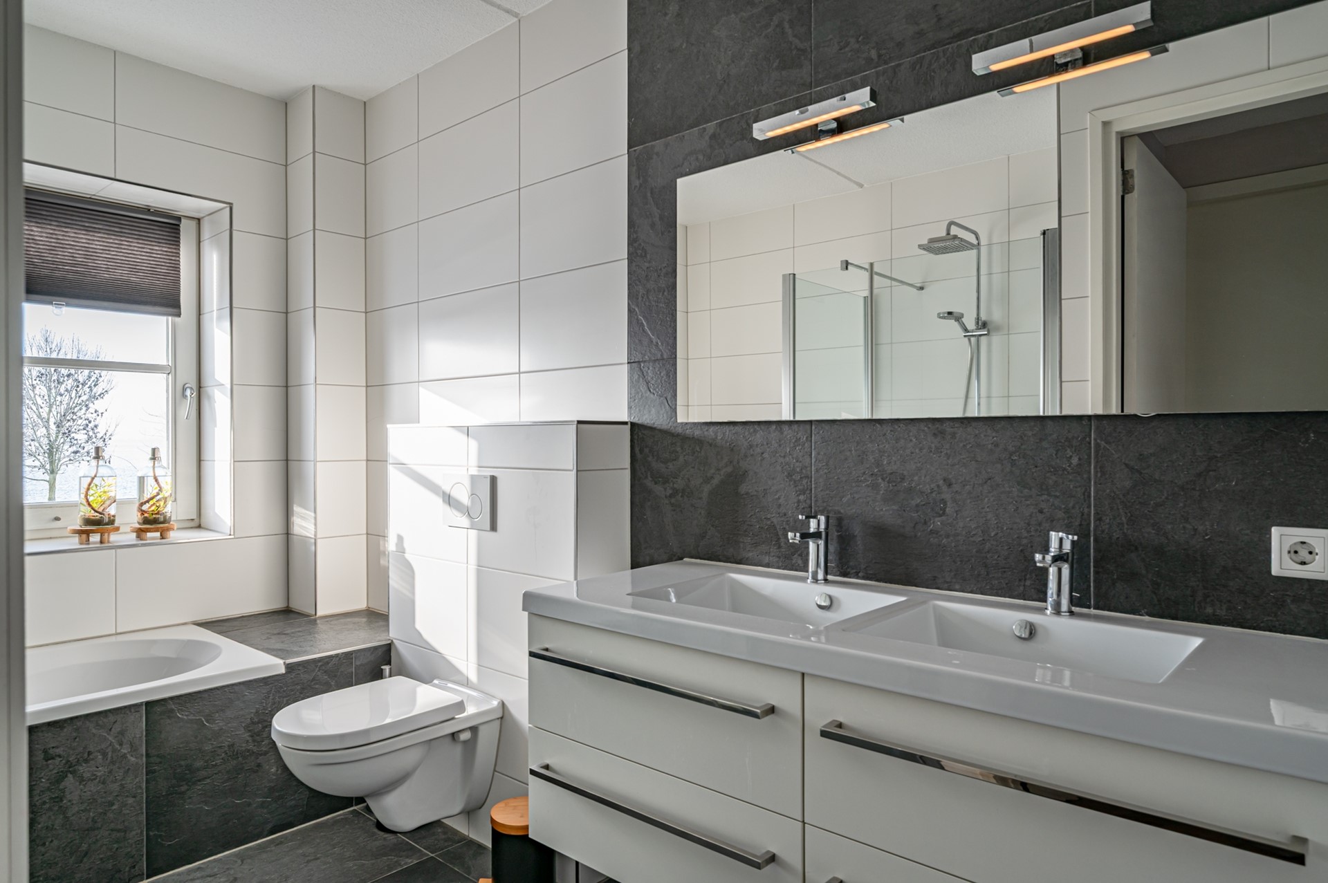 • Luxe, volledig betegelde badkamer met ligbad, inloopdouche, dubbele wastafelmeubel, toilet en mechanische ventilatie.