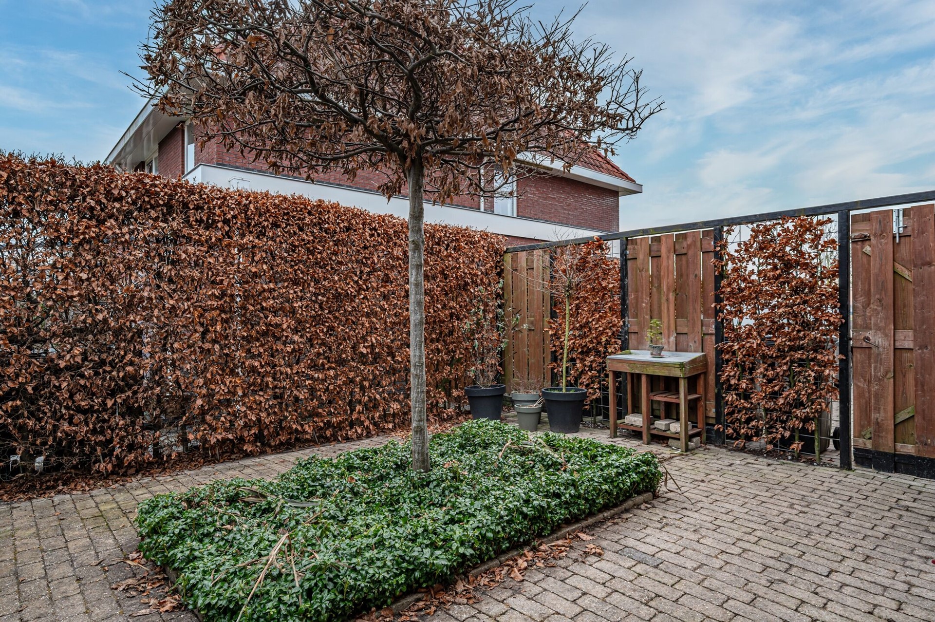• Verzorgde achtertuin met een terras, gazon, hagen en beplanting.
