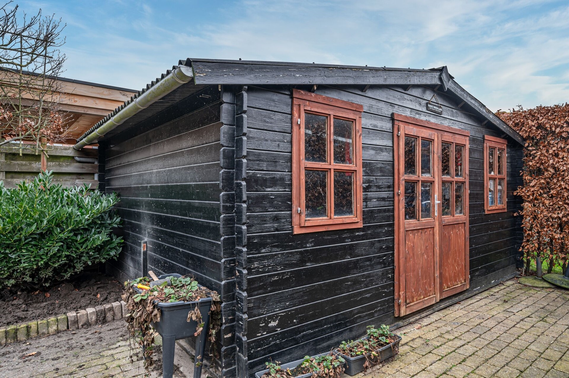 • Houten tuinhuis met betonvloer en dak van golfplaten voor tuingereedschap en fietsen in achtertuin aanwezig