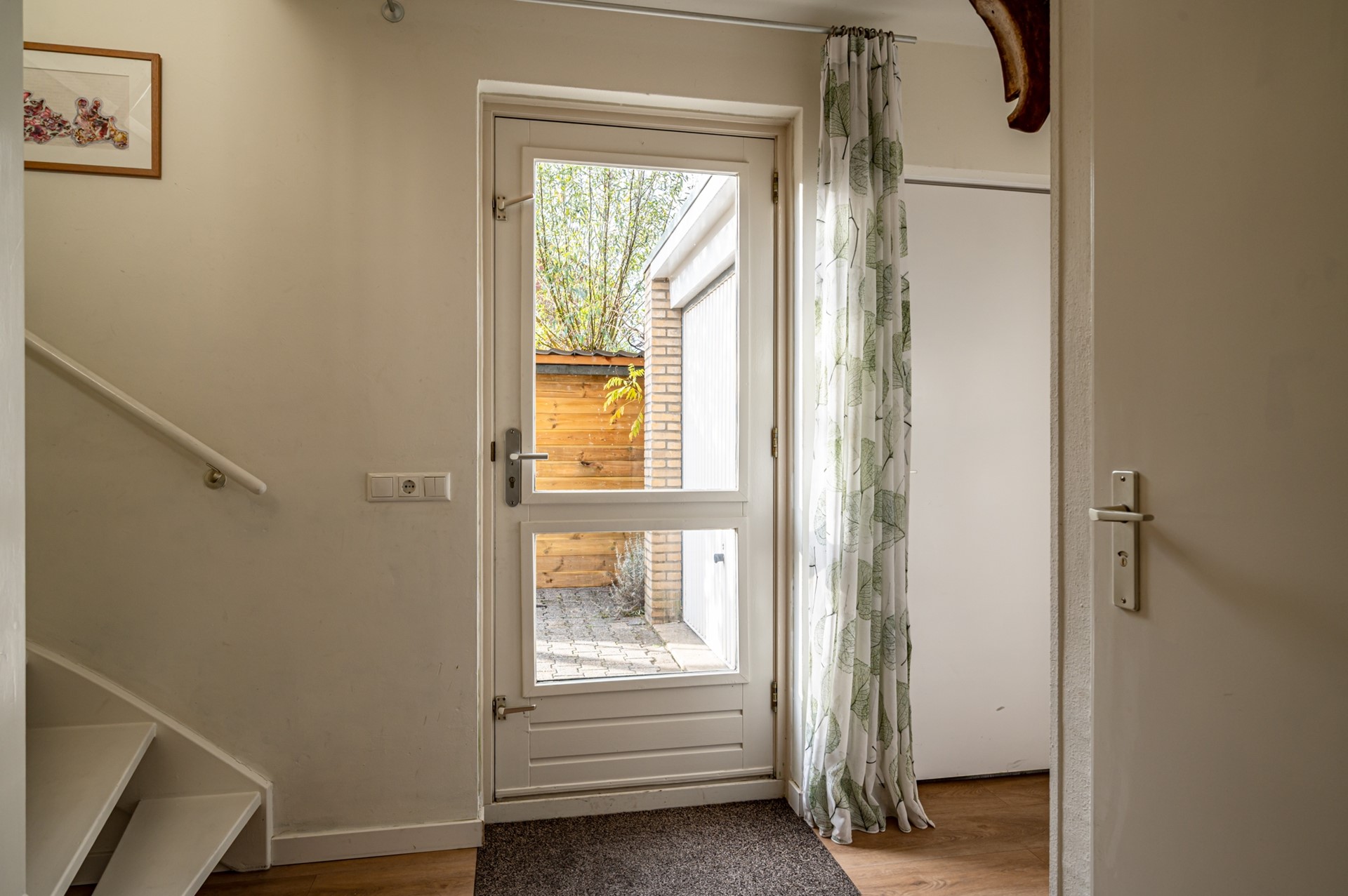 • Entree met hal, meterkast, modern toilet, trapopgang en deuren naar garage en woonkamer.