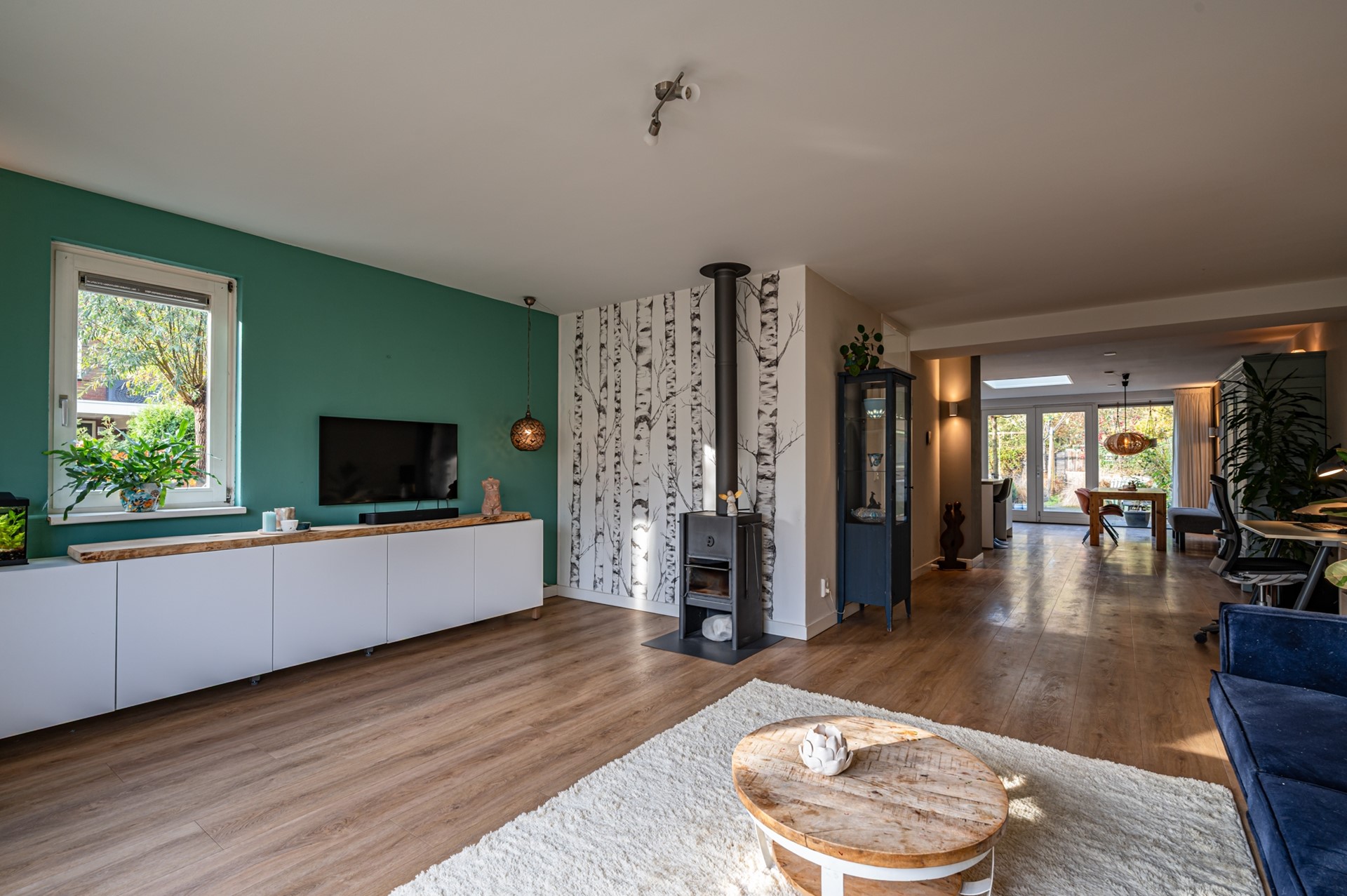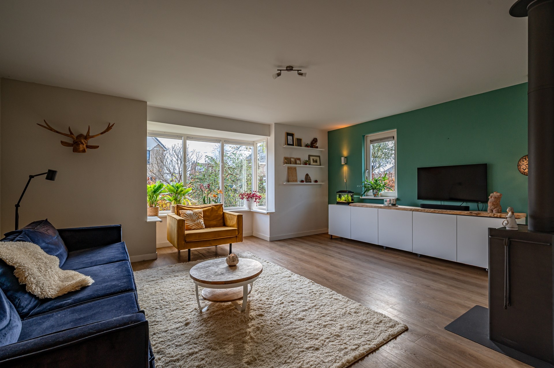 • Zeer ruime L-vormige woonkamer met erker, lichte PVC-vloer met vloerverwarming en een rookkanaal (houtkachel blijft niet achter).