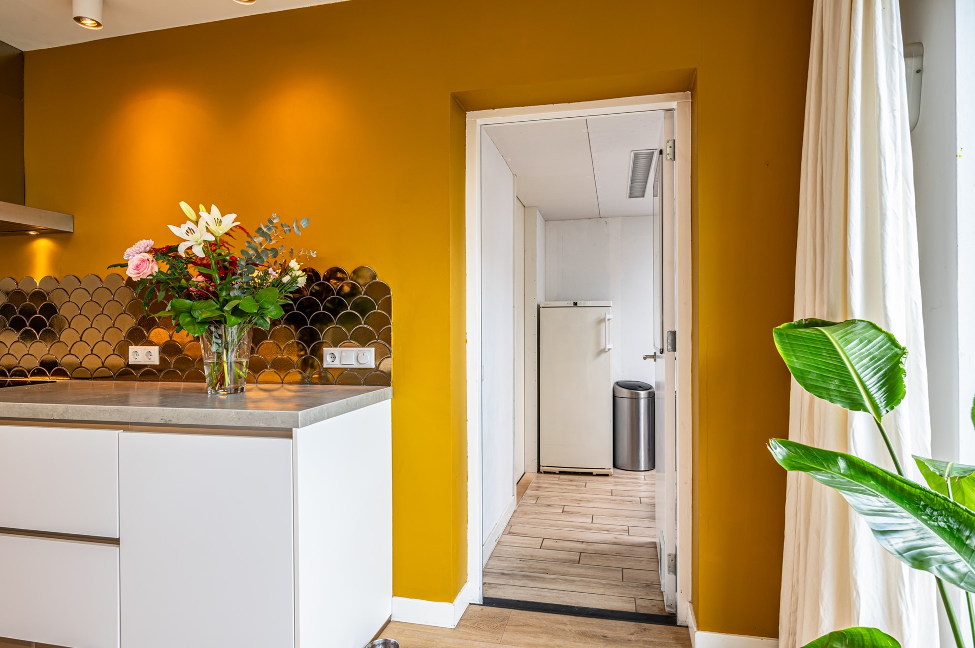 • Praktische bijkeuken met witgoedaansluitingen, lameltegelvloer met elektrische vloerverwarming en extra keukenblok met koud water. Natuurlijke lichtinval door de grote lichtkoepel. Deur naar de tuin.