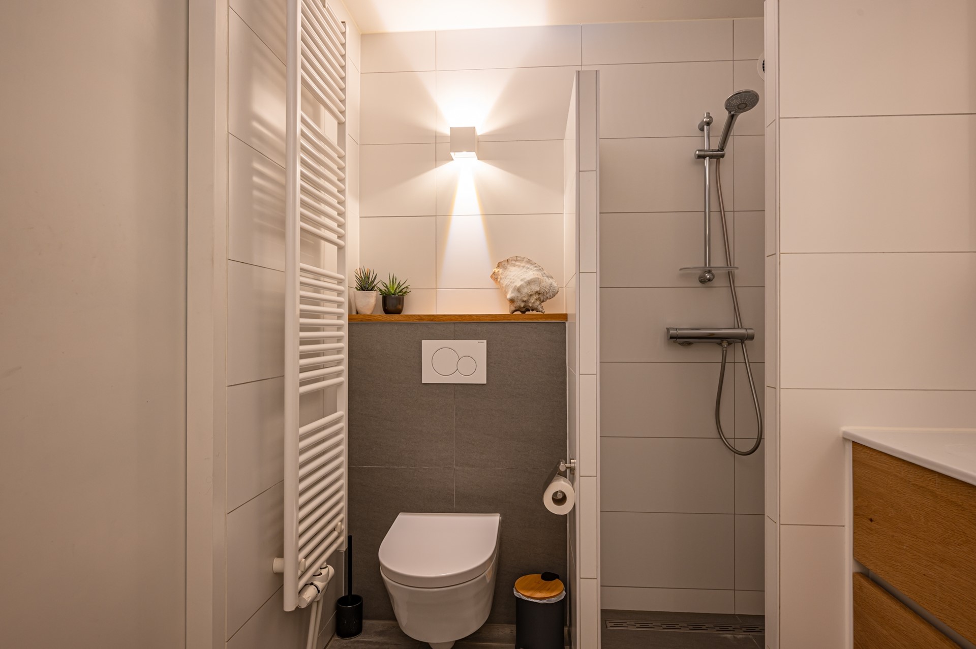 • Luxe, volledig betegelde badkamer (2018) met ligbad, inloopdouche, wastafelmeubel, toilet, designradiator en mechanische ventilatie.