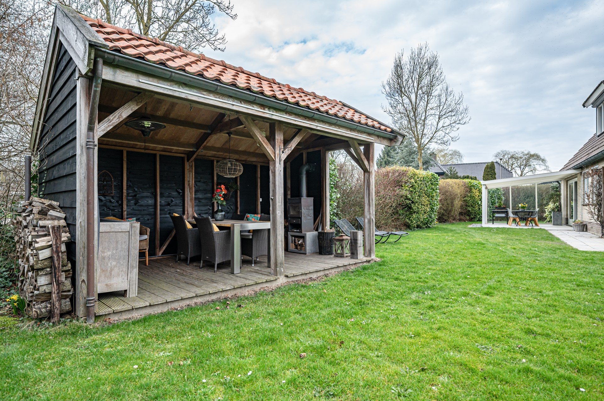 • overkapping aan de woning met onderheide vloer, plavuizen, verlichting, glazen wand en overige wanden afsluitbaar met zeildoek